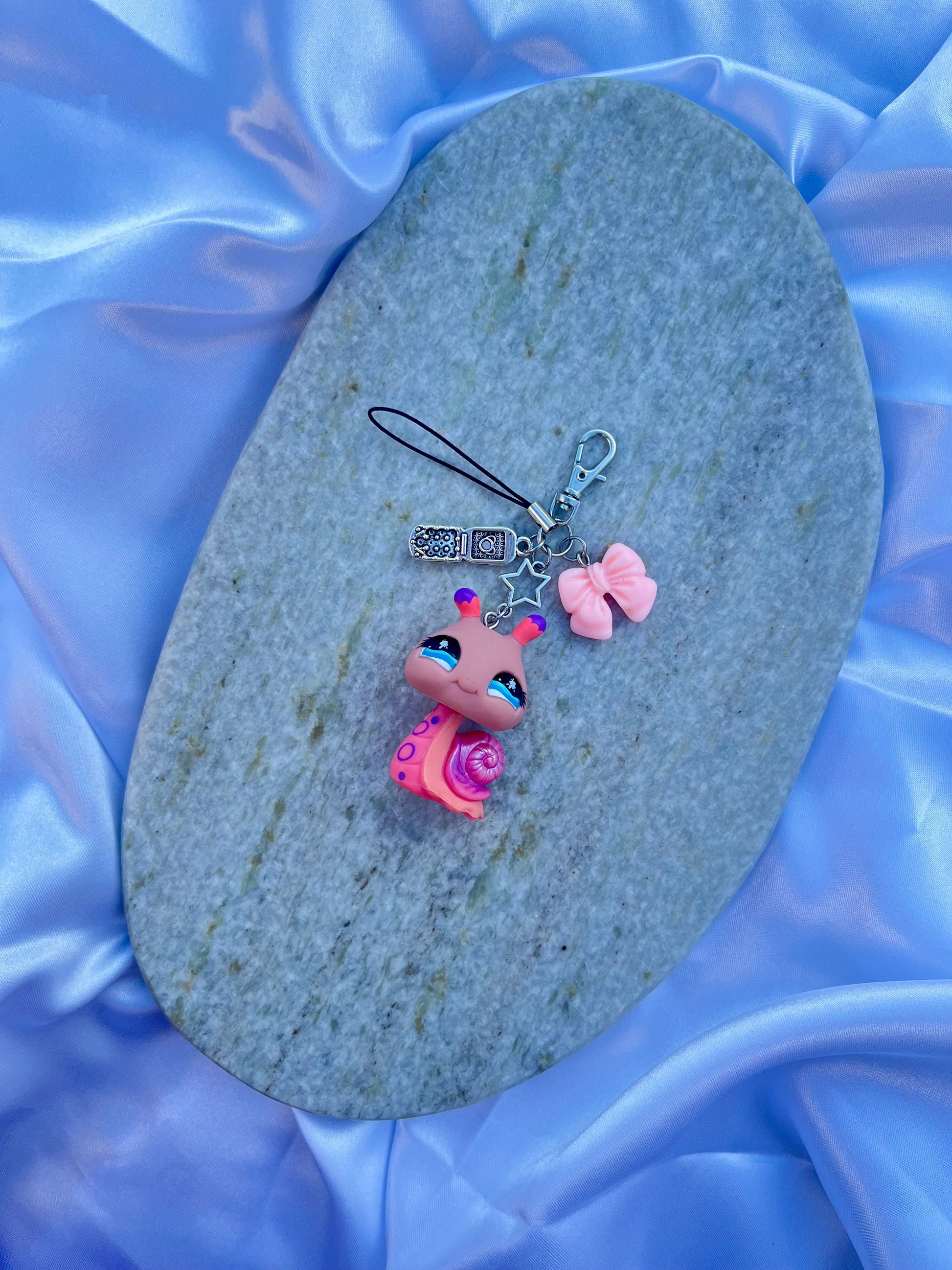 Matériaux : figurine d’occasion (plastique / PVC / résine selon pièce), anneau/maillon acier inoxydable, tige/rivets métalliques ou mousqueton selon modèle. Chaque création est complétée avec un ou plusieurs charms décoratifs.