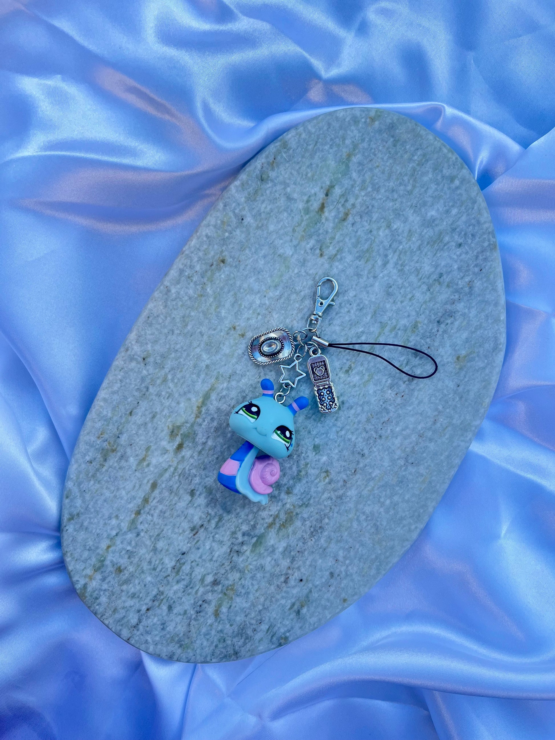 Matériaux : figurine d’occasion (plastique / PVC / résine selon pièce), anneau/maillon acier inoxydable, tige/rivets métalliques ou mousqueton selon modèle. Chaque création est complétée avec un ou plusieurs charms décoratifs.