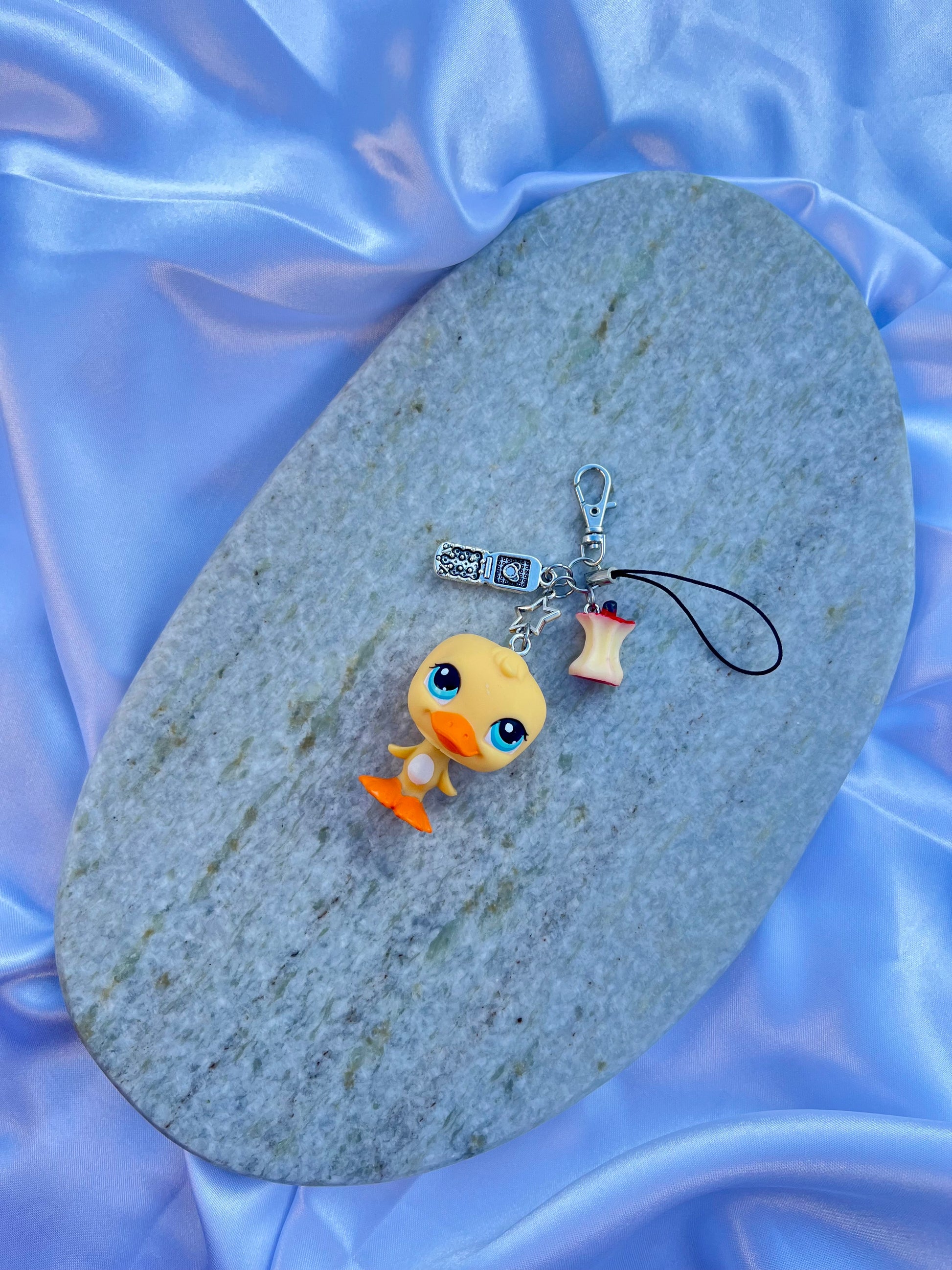Matériaux : figurine d’occasion (plastique / PVC / résine selon pièce), anneau/maillon acier inoxydable, tige/rivets métalliques ou mousqueton selon modèle. Chaque création est complétée avec un ou plusieurs charms décoratifs.