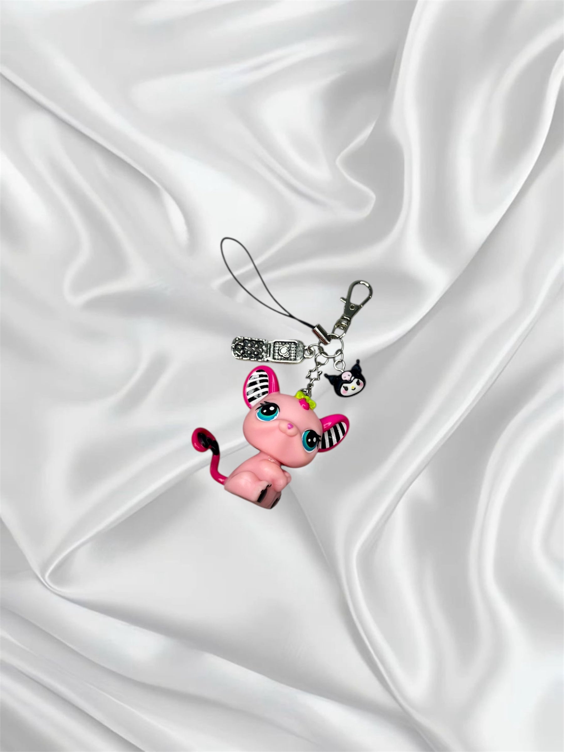 Matériaux : figurine d’occasion (plastique / PVC / résine selon pièce), anneau/maillon acier inoxydable, tige/rivets métalliques ou mousqueton selon modèle. Chaque création est complétée avec un ou plusieurs charms décoratifs.
