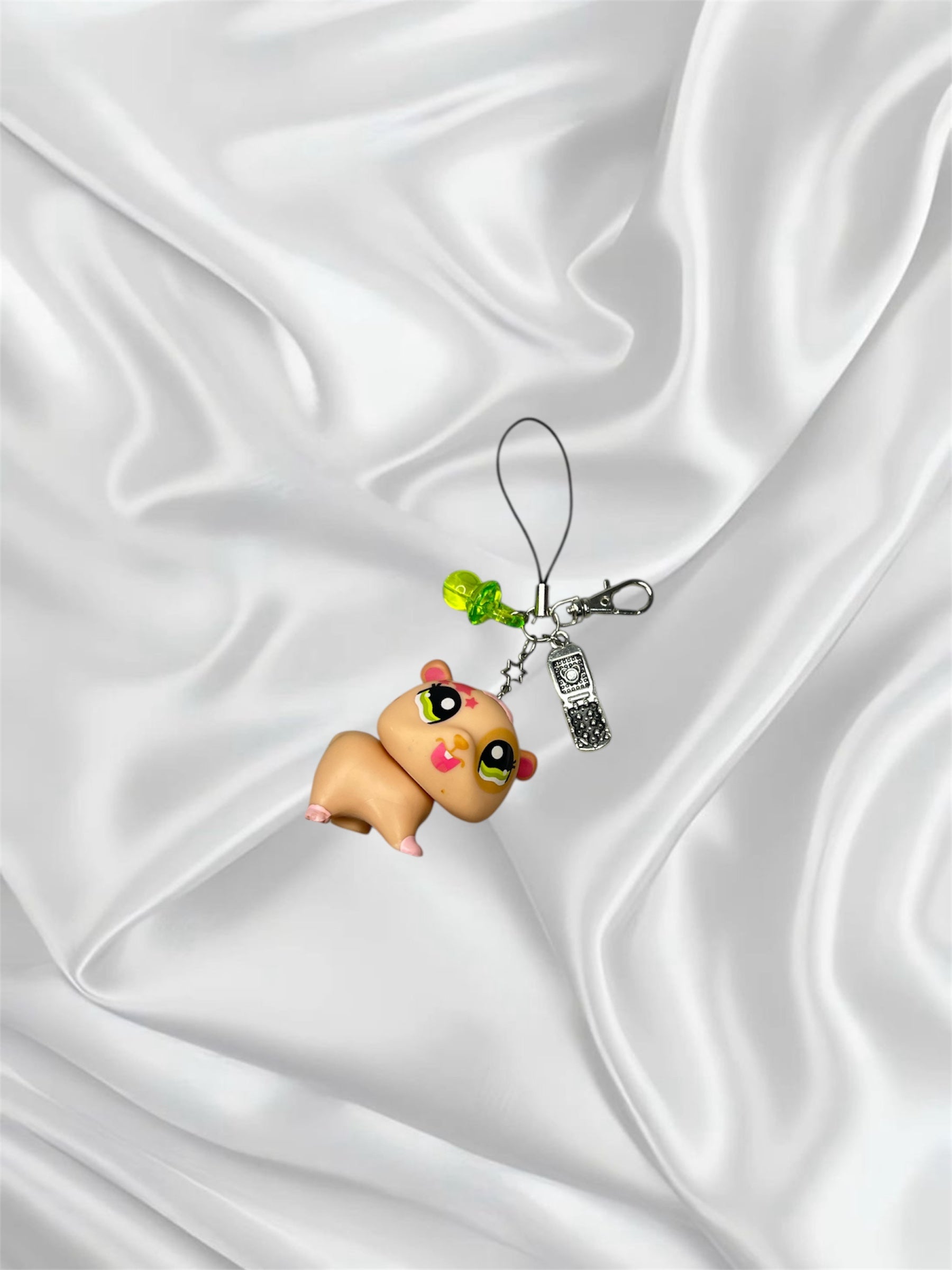 Matériaux : figurine d’occasion (plastique / PVC / résine selon pièce), anneau/maillon acier inoxydable, tige/rivets métalliques ou mousqueton selon modèle. Chaque création est complétée avec un ou plusieurs charms décoratifs.
