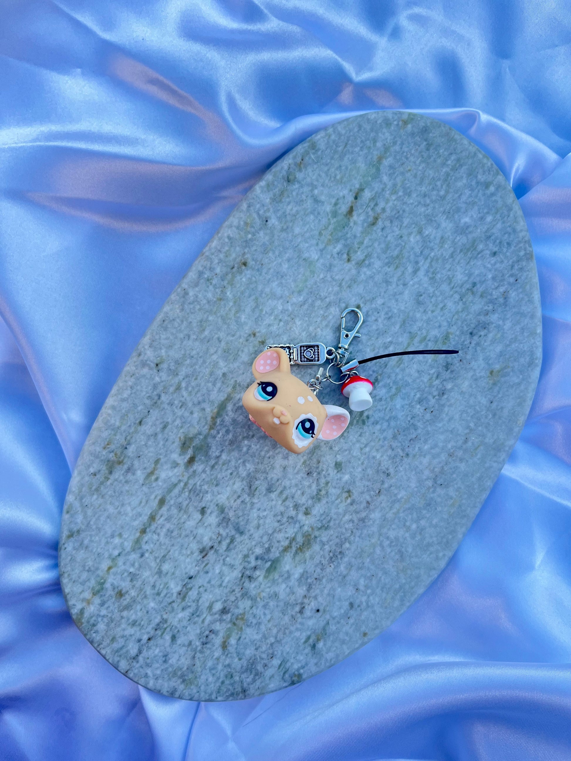 Matériaux : figurine d’occasion (plastique / PVC / résine selon pièce), anneau/maillon acier inoxydable, tige/rivets métalliques ou mousqueton selon modèle. Chaque création est complétée avec un ou plusieurs charms décoratifs.