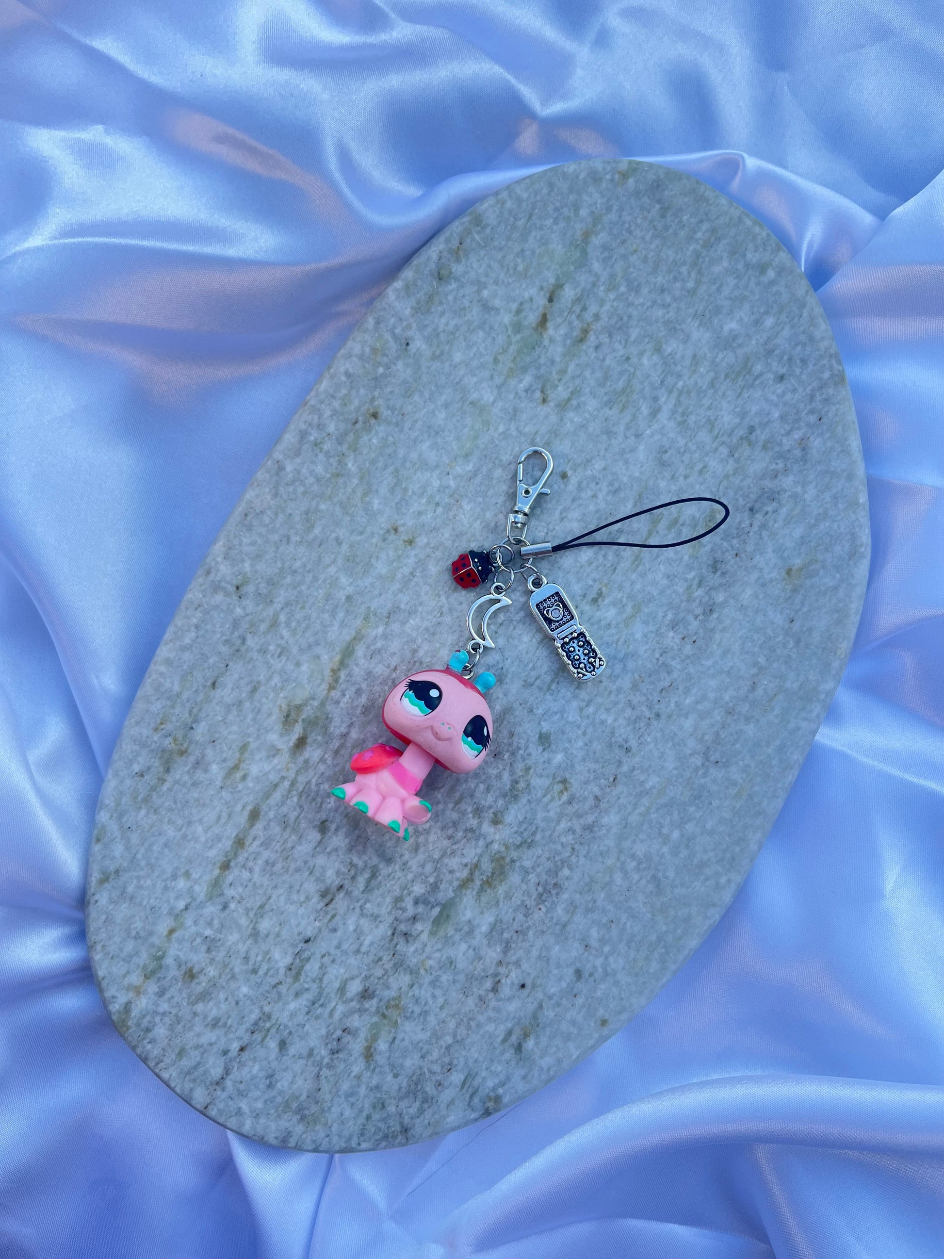 Matériaux : figurine d’occasion (plastique / PVC / résine selon pièce), anneau/maillon acier inoxydable, tige/rivets métalliques ou mousqueton selon modèle. Chaque création est complétée avec un ou plusieurs charms décoratifs.