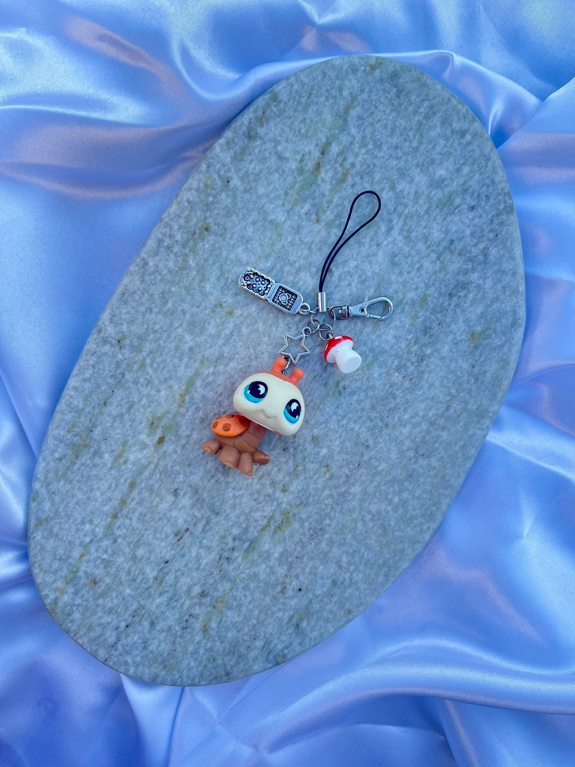 Matériaux : figurine d’occasion (plastique / PVC / résine selon pièce), anneau/maillon acier inoxydable, tige/rivets métalliques ou mousqueton selon modèle. Chaque création est complétée avec un ou plusieurs charms décoratifs.