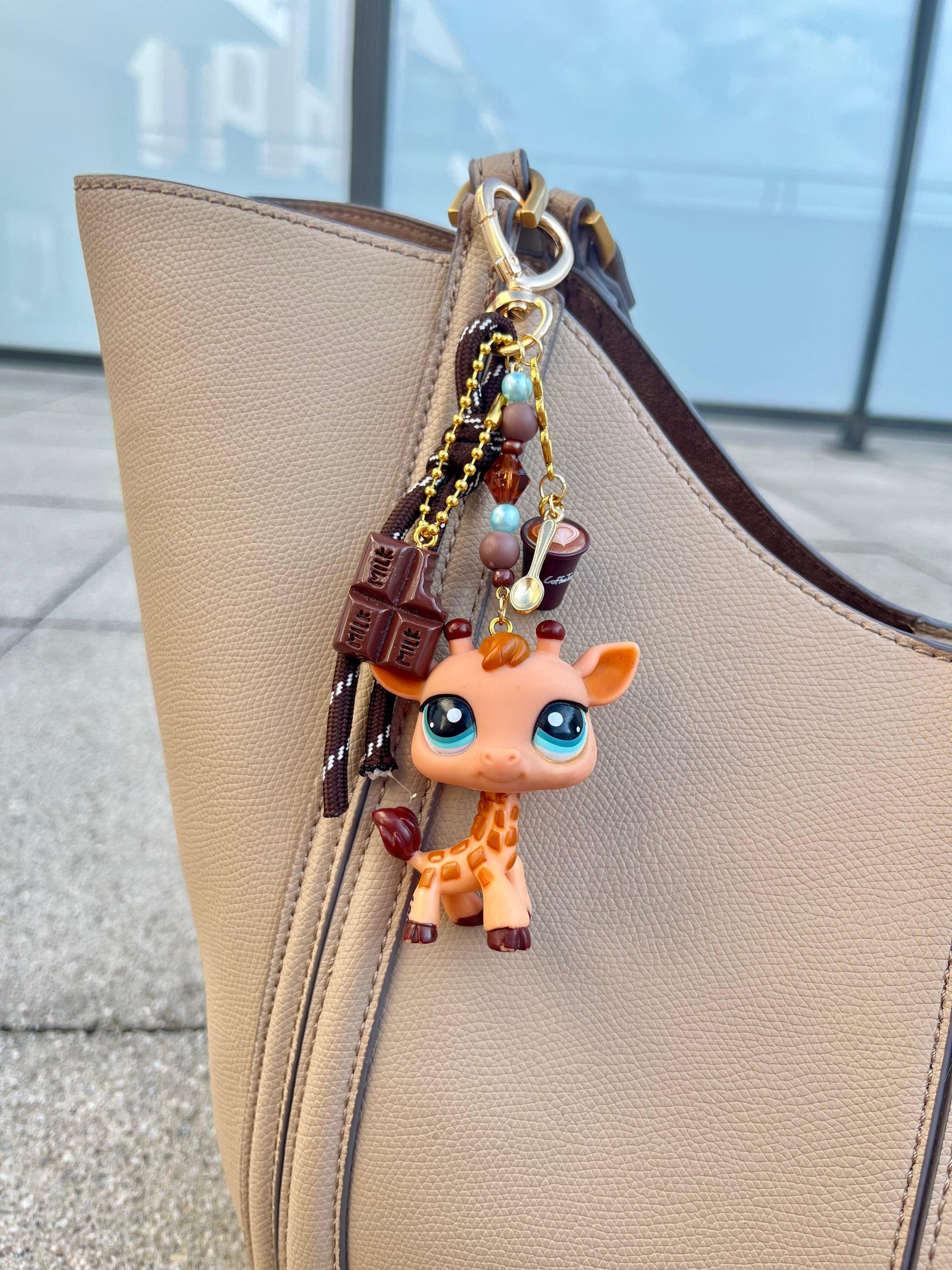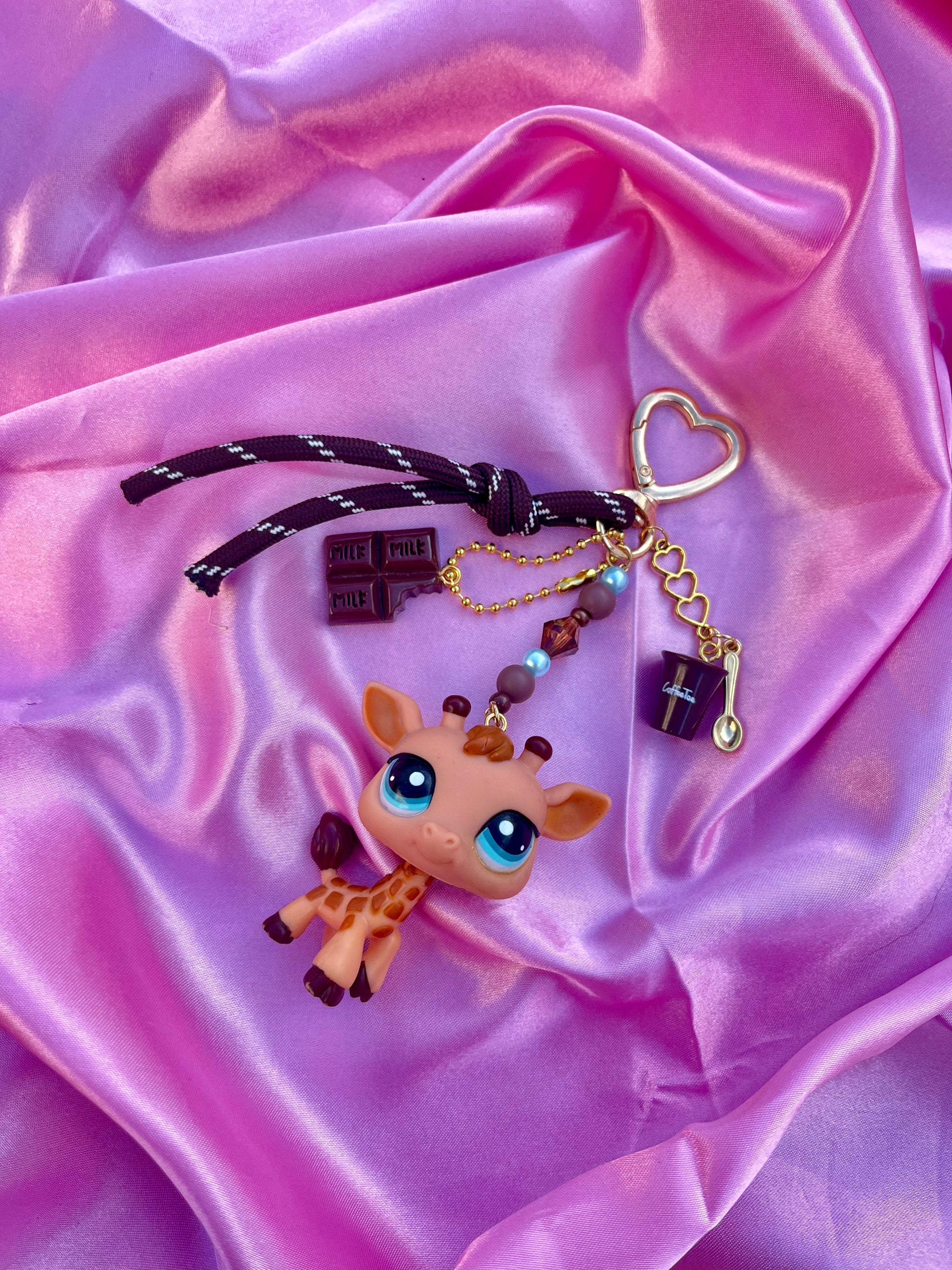 Matériaux : figurine d’occasion (plastique / PVC / résine selon pièce), anneau/maillon acier inoxydable, tige/rivets métalliques ou mousqueton selon modèle. Chaque création est complétée avec un ou plusieurs charms décoratifs et perles.