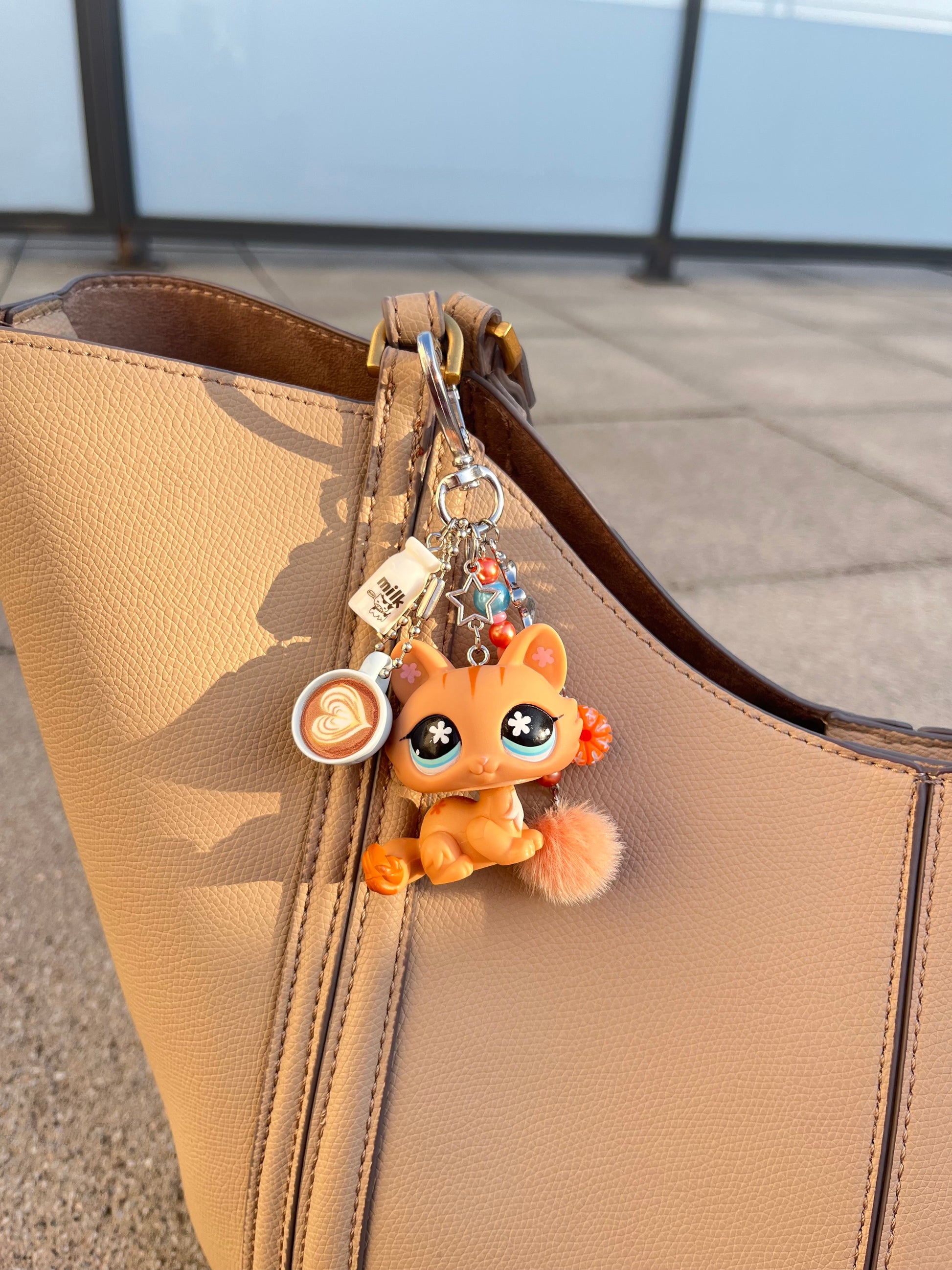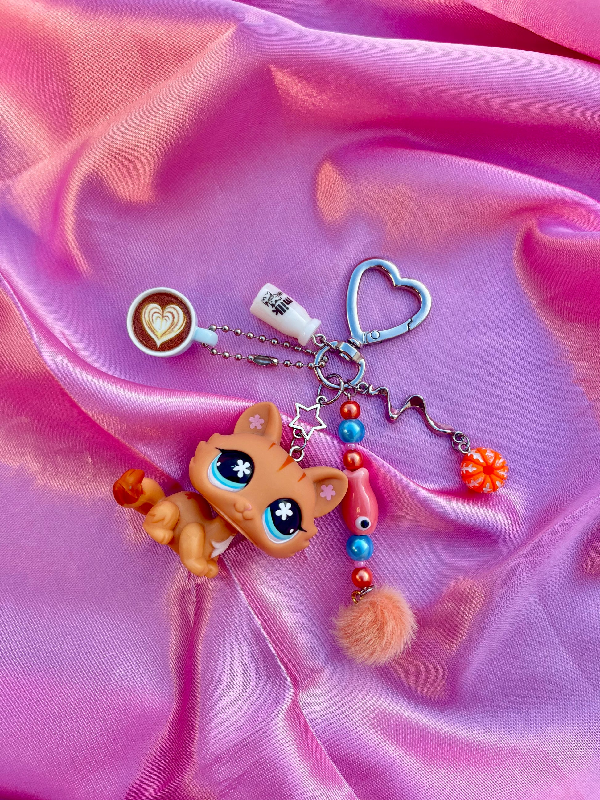 Matériaux : figurine d’occasion (plastique / PVC / résine selon pièce), anneau/maillon acier inoxydable, tige/rivets métalliques ou mousqueton selon modèle. Chaque création est complétée avec un ou plusieurs charms décoratifs et perles.