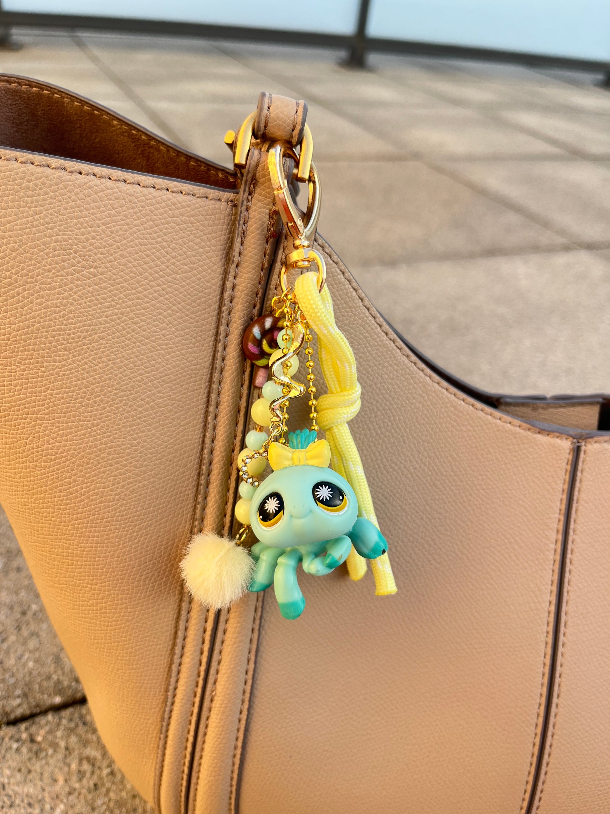 Matériaux : figurine d’occasion (plastique / PVC / résine selon pièce), anneau/maillon acier inoxydable, tige/rivets métalliques ou mousqueton selon modèle. Chaque création est complétée avec un ou plusieurs charms décoratifs et perles.