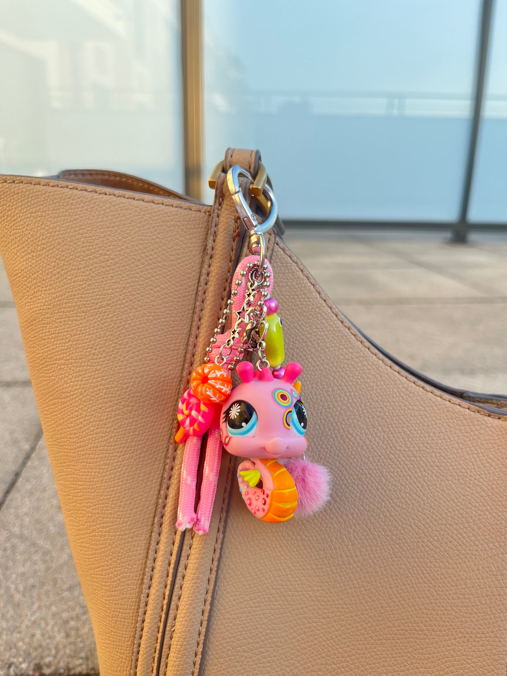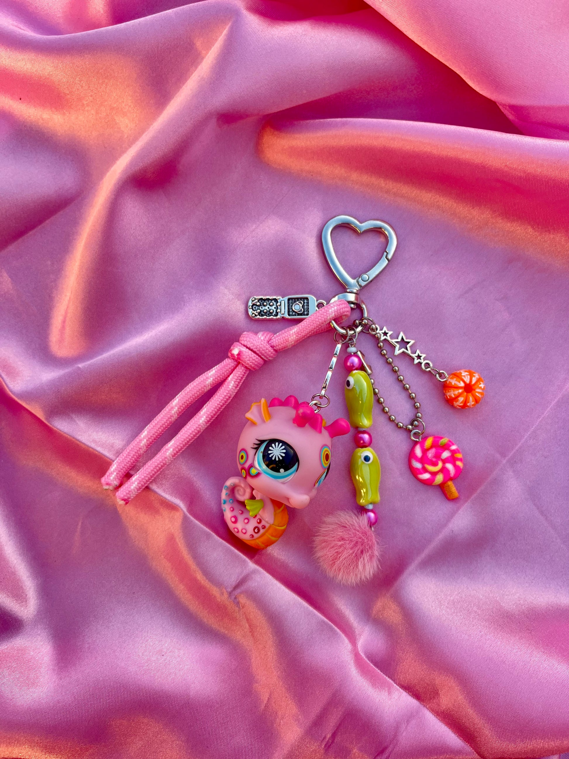 Matériaux : figurine d’occasion (plastique / PVC / résine selon pièce), anneau/maillon acier inoxydable, tige/rivets métalliques ou mousqueton selon modèle. Chaque création est complétée avec un ou plusieurs charms décoratifs et perles.