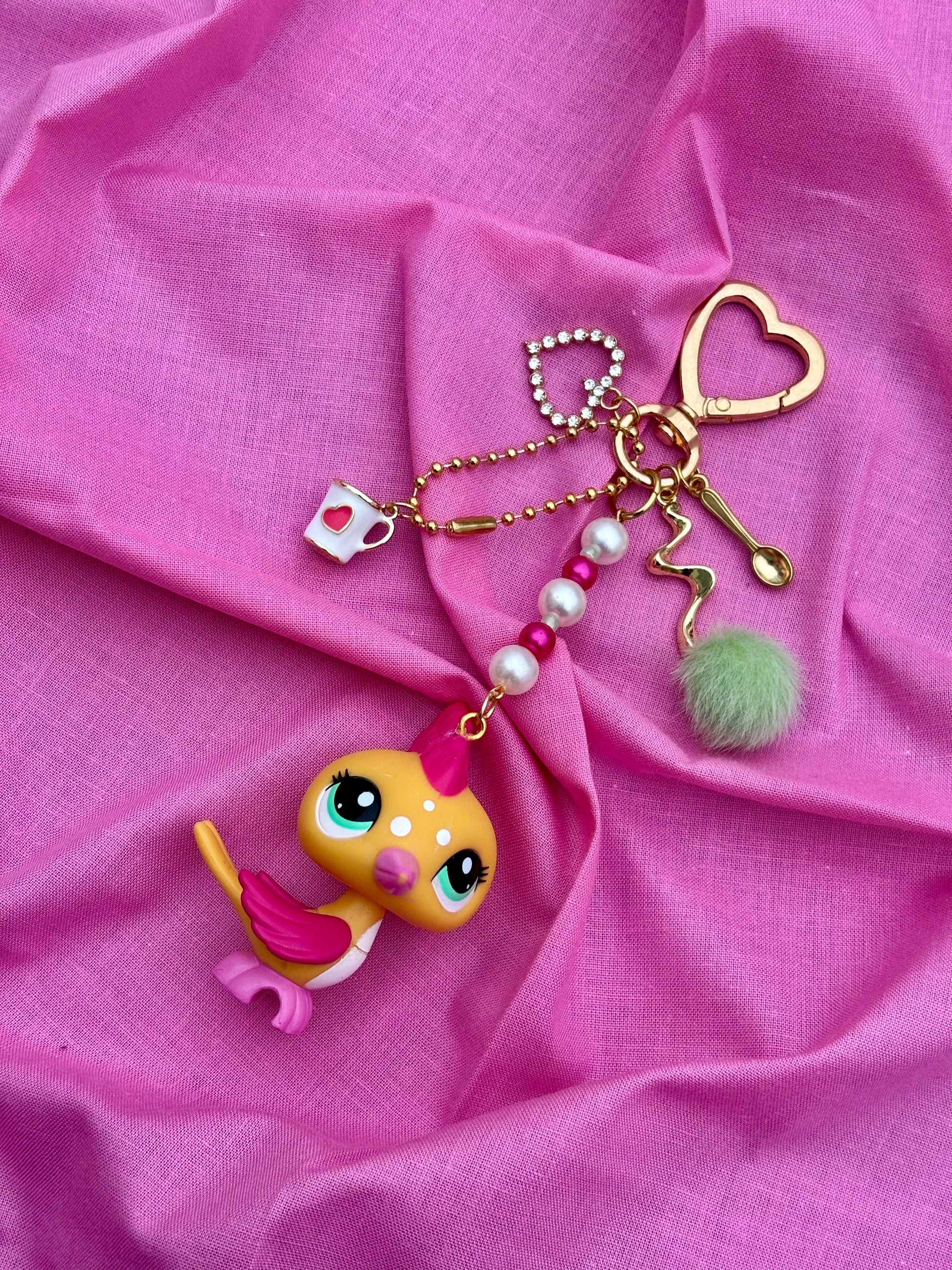Matériaux : figurine d’occasion (plastique / PVC / résine selon pièce), anneau/maillon acier inoxydable, tige/rivets métalliques ou mousqueton selon modèle. Chaque création est complétée avec un ou plusieurs charms décoratifs et perles.