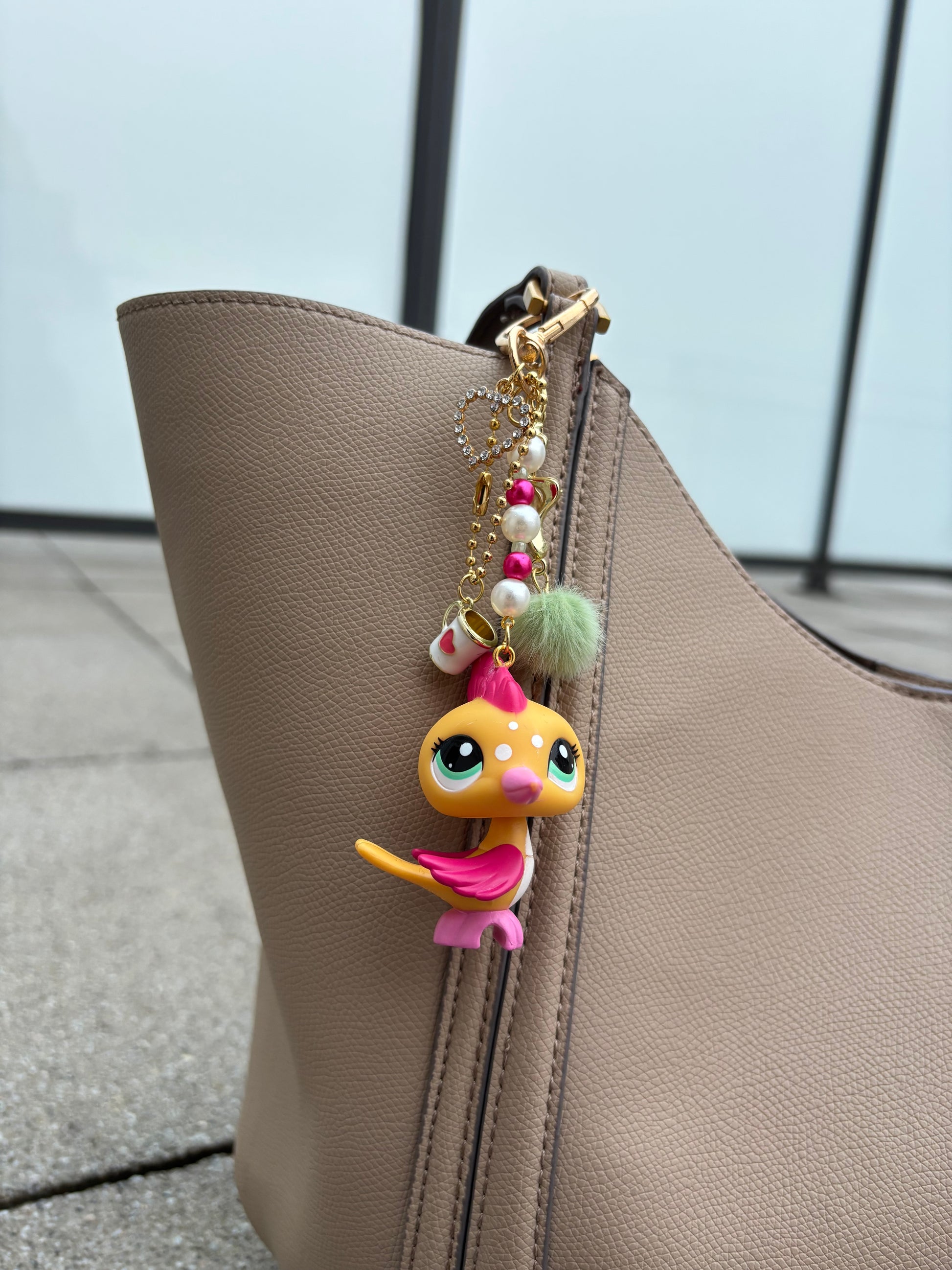 Davina, le pivert rose et jaune. Avec ses yeux verts pétillants, elle apporte de la couleur partout. Accroche-la à ton sac et laisse la t’accompagner partout et ensoleillée ta journée. 💛💗✨