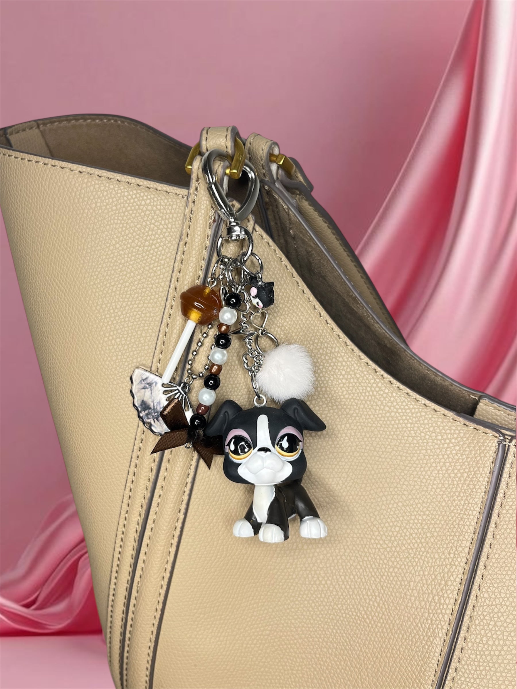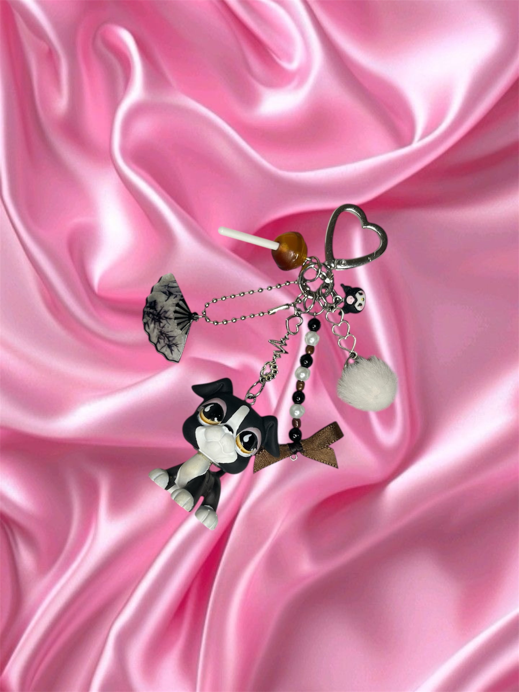 Matériaux : figurine d’occasion (plastique / PVC / résine selon pièce), anneau/maillon acier inoxydable, tige/rivets métalliques ou mousqueton selon modèle. Chaque création est complétée avec un ou plusieurs charms décoratifs et perles.