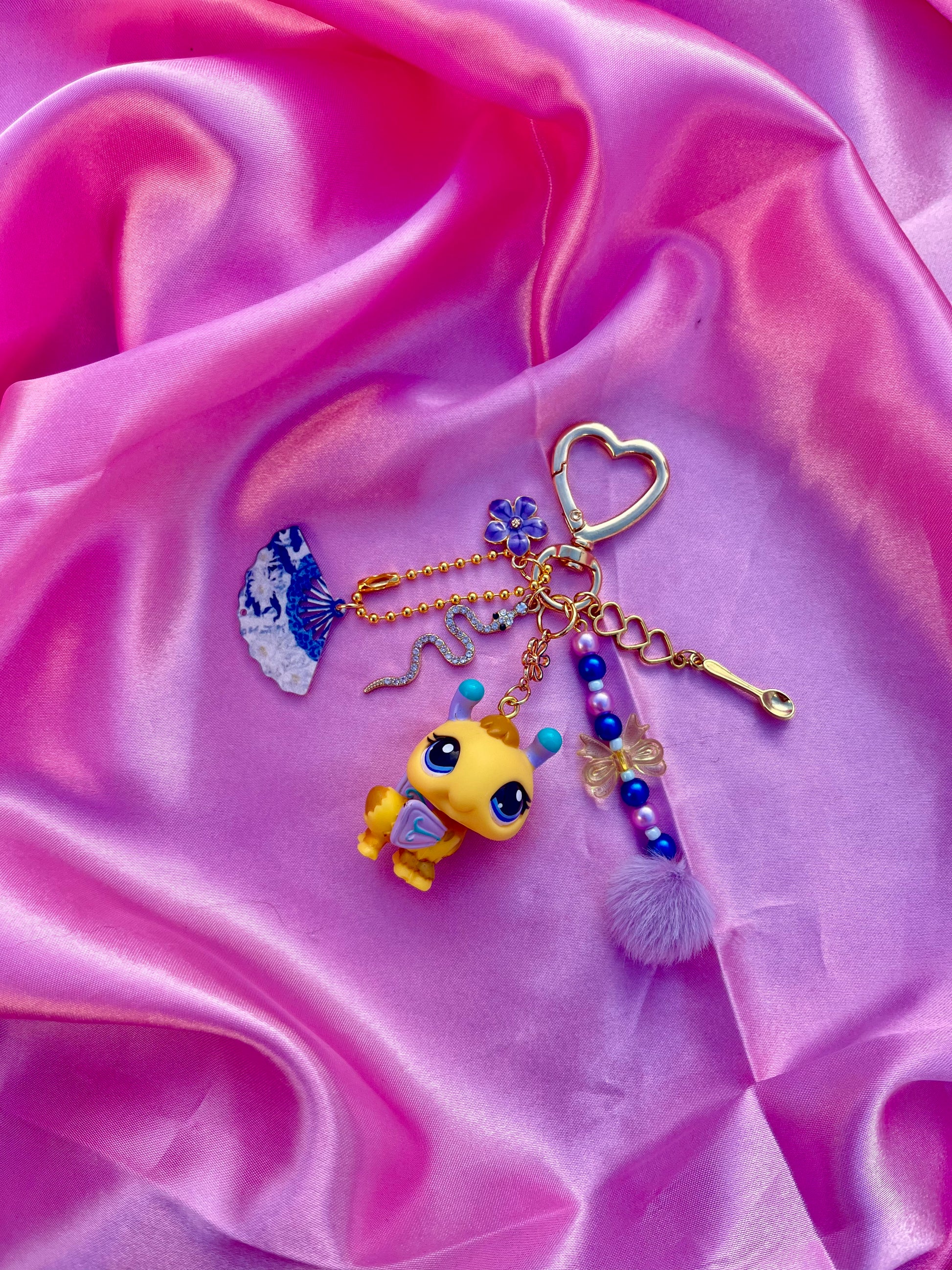 Matériaux : figurine d’occasion (plastique / PVC / résine selon pièce), anneau/maillon acier inoxydable, tige/rivets métalliques ou mousqueton selon modèle. Chaque création est complétée avec un ou plusieurs charms décoratifs et perles.