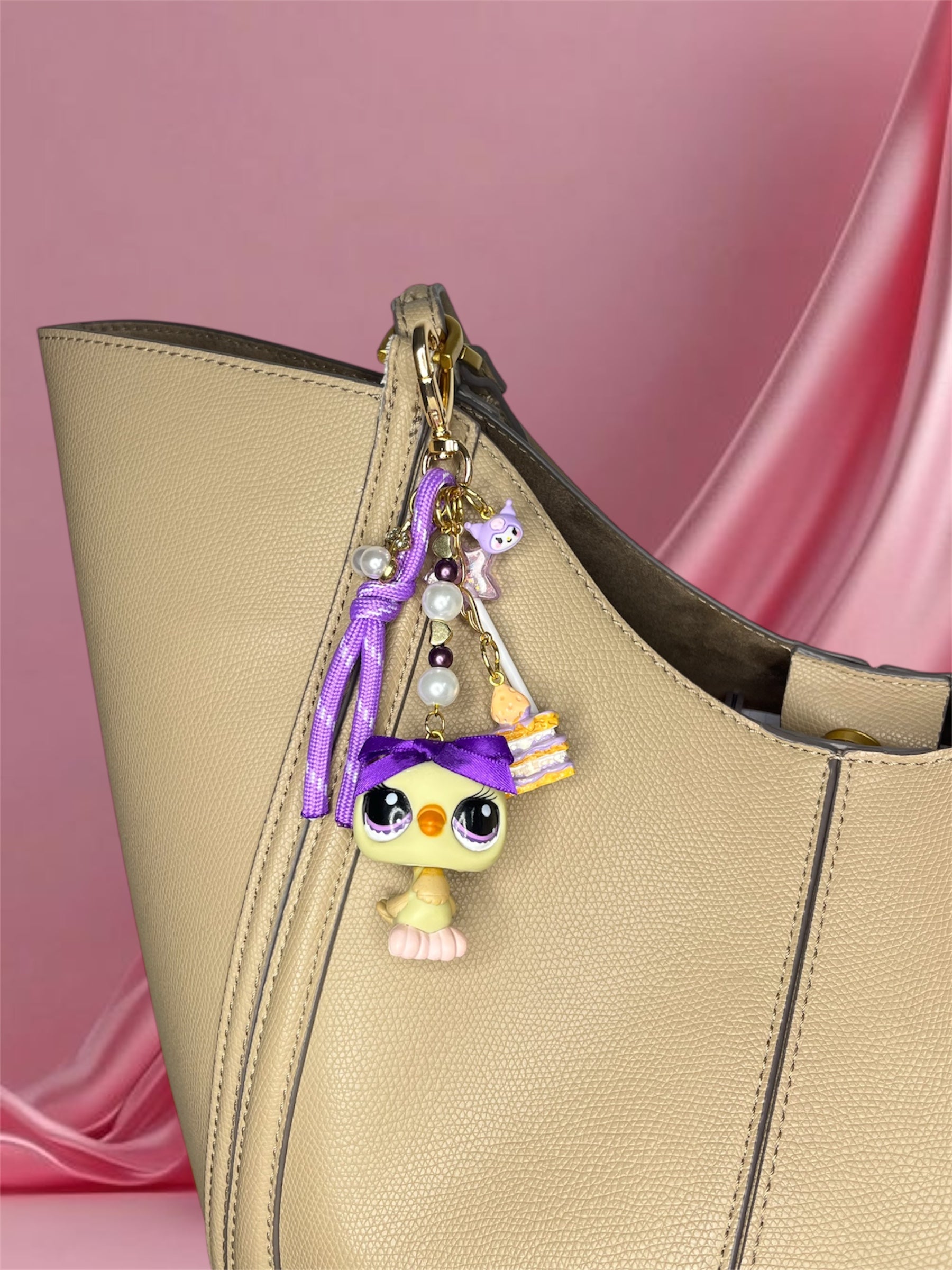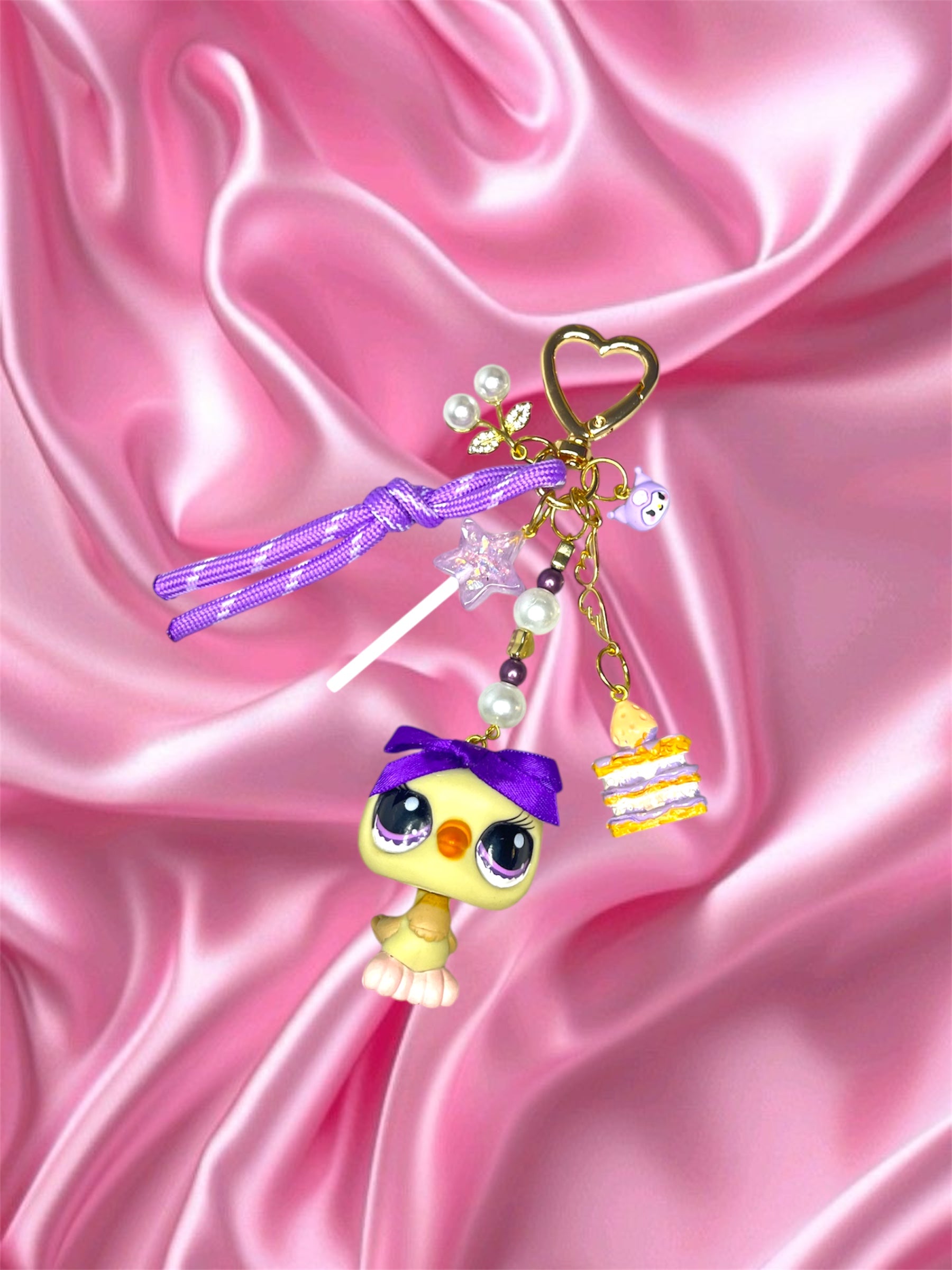 Matériaux : figurine d’occasion (plastique / PVC / résine selon pièce), anneau/maillon acier inoxydable, tige/rivets métalliques ou mousqueton selon modèle. Chaque création est complétée avec un ou plusieurs charms décoratifs et perles.