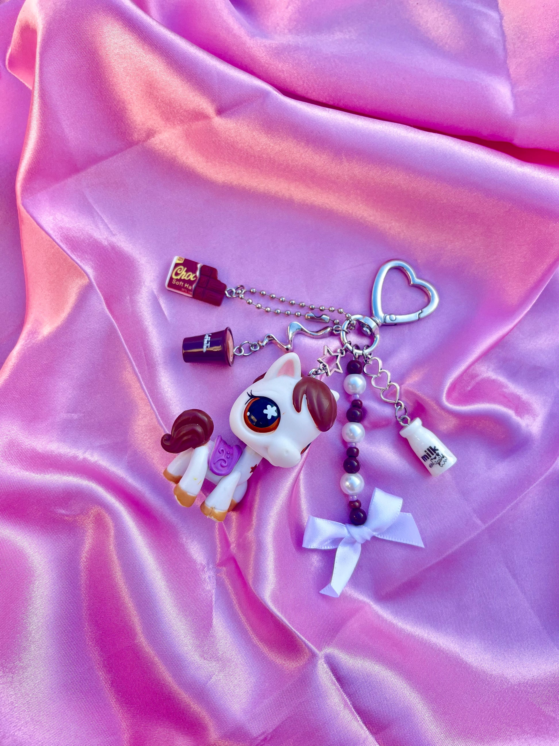 Matériaux : figurine d’occasion (plastique / PVC / résine selon pièce), anneau/maillon acier inoxydable, tige/rivets métalliques ou mousqueton selon modèle. Chaque création est complétée avec un ou plusieurs charms décoratifs et perles.