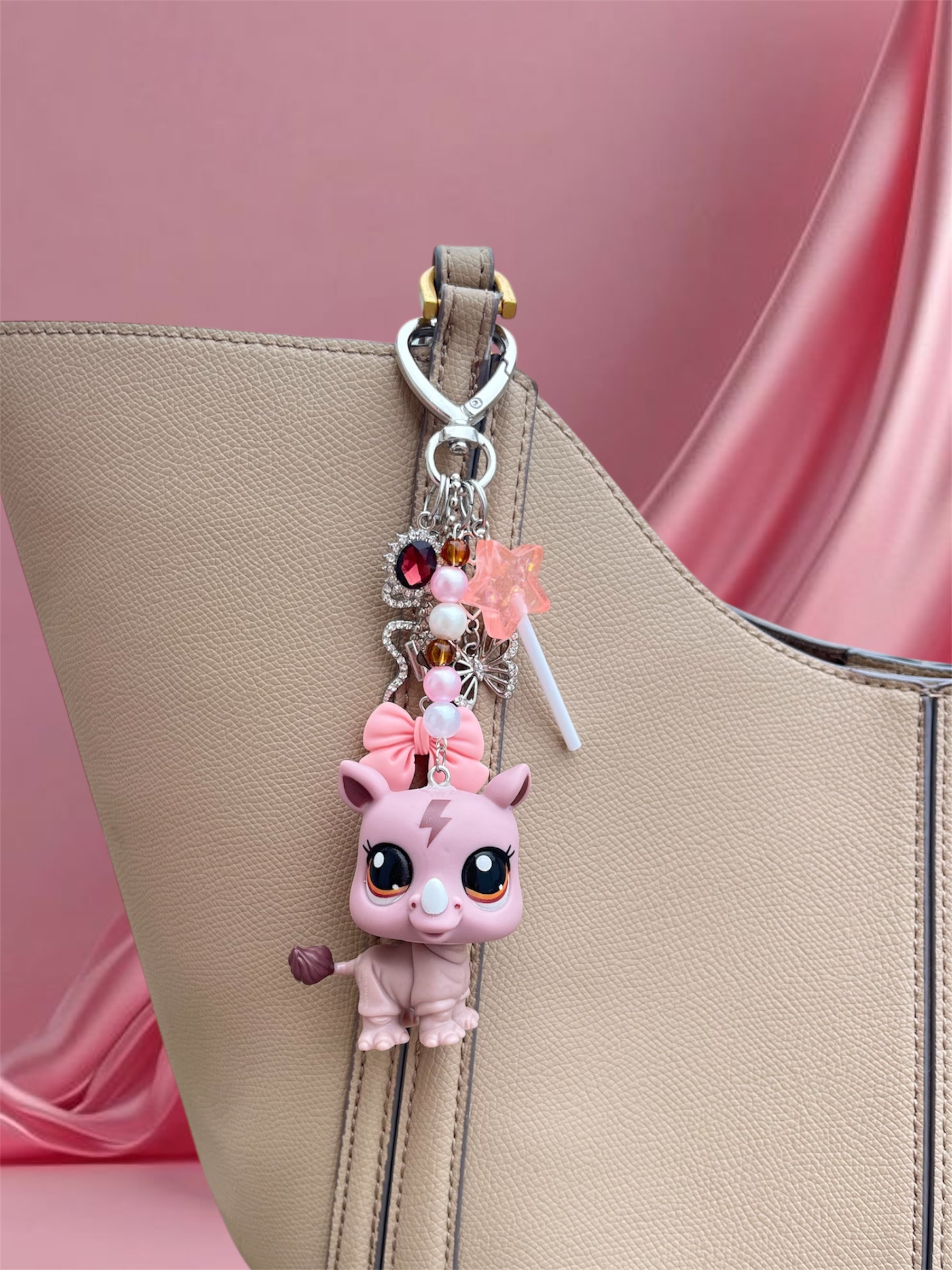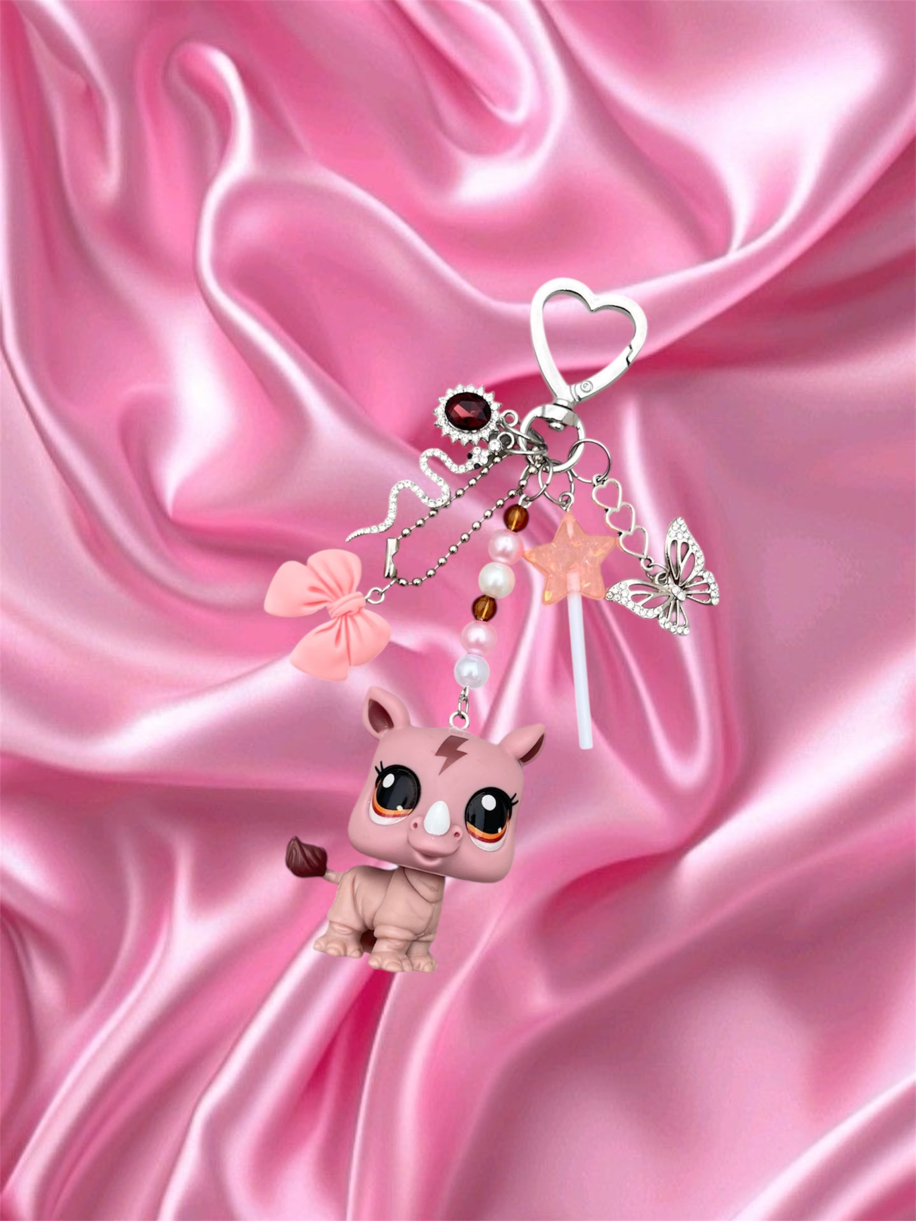 Matériaux : figurine d’occasion (plastique / PVC / résine selon pièce), anneau/maillon acier inoxydable, tige/rivets métalliques ou mousqueton selon modèle. Chaque création est complétée avec un ou plusieurs charms décoratifs et perles.