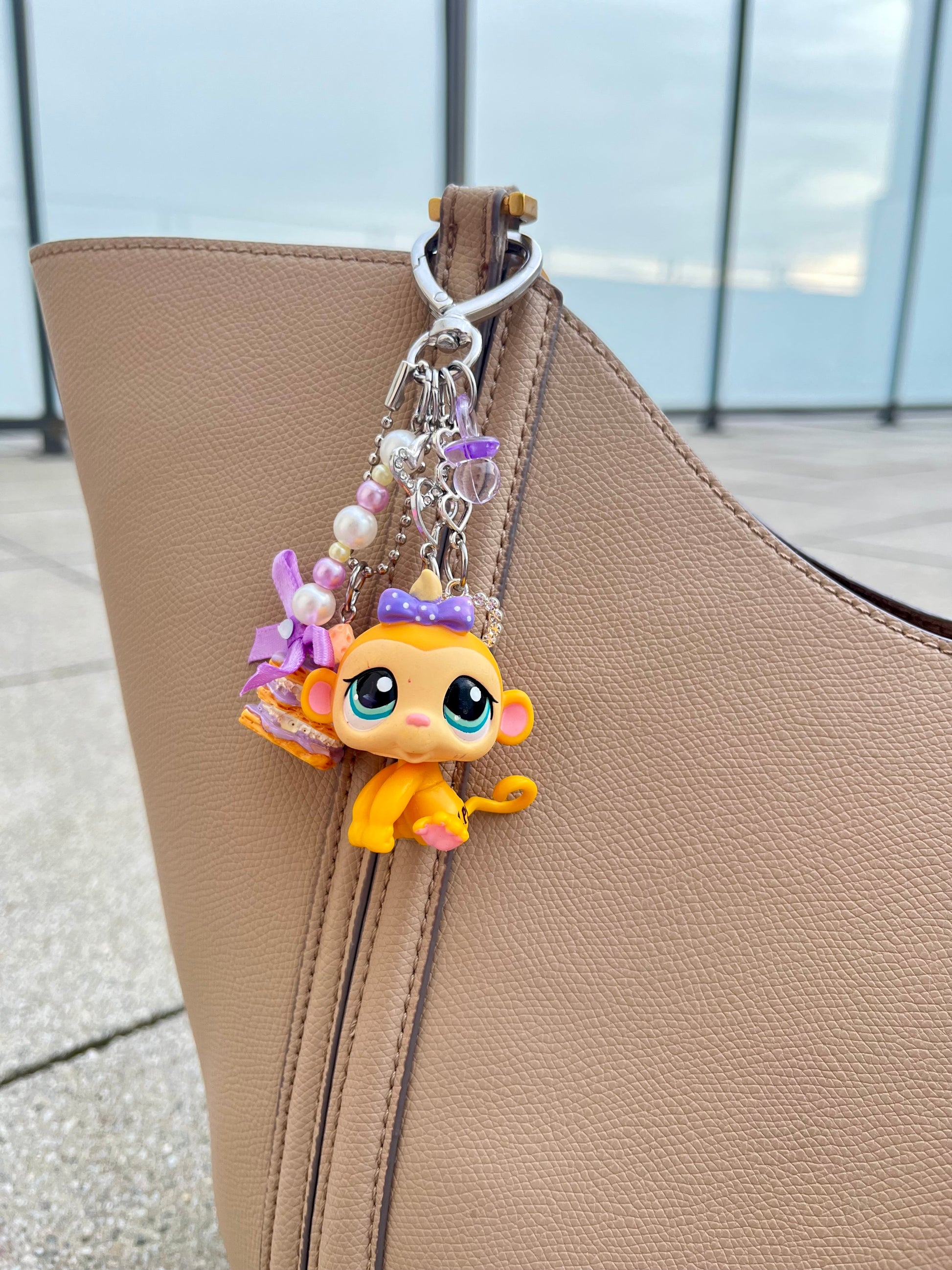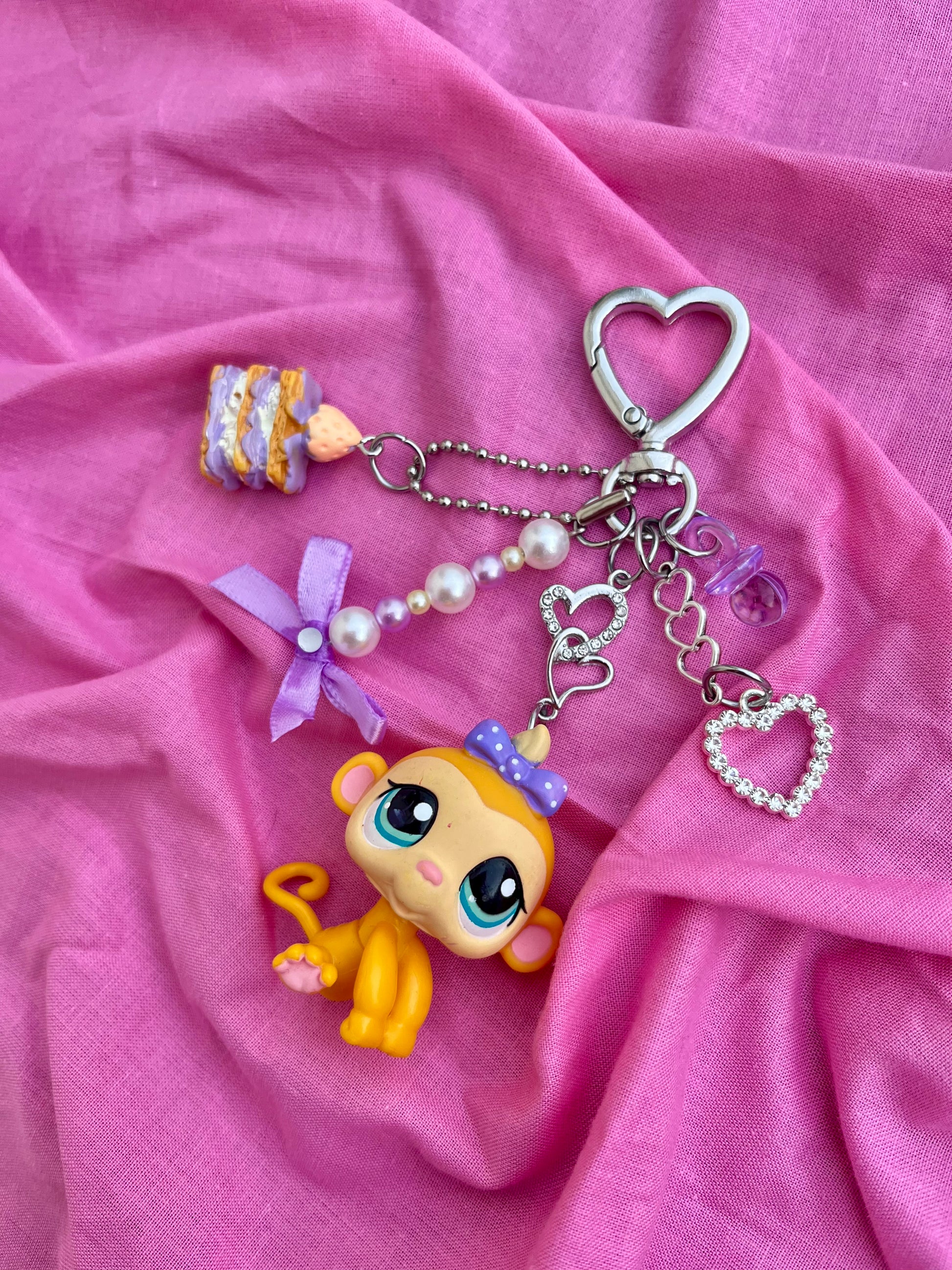 Matériaux : figurine d’occasion (plastique / PVC / résine selon pièce), anneau/maillon acier inoxydable, tige/rivets métalliques ou mousqueton selon modèle. Chaque création est complétée avec un ou plusieurs charms décoratifs et perles.