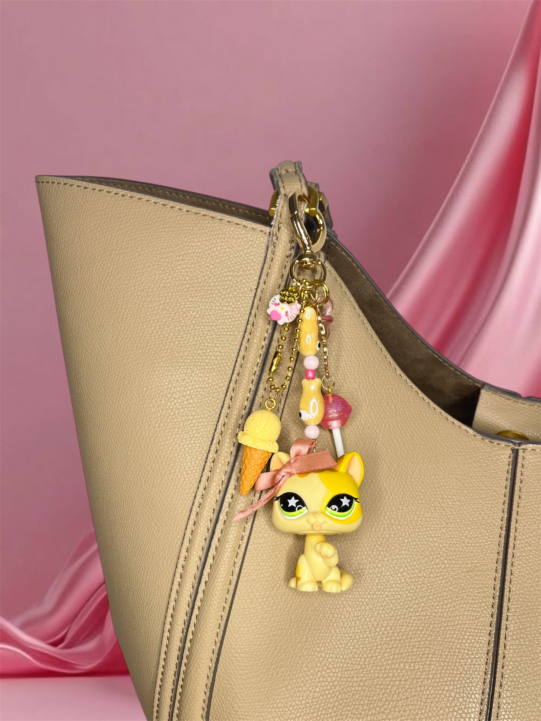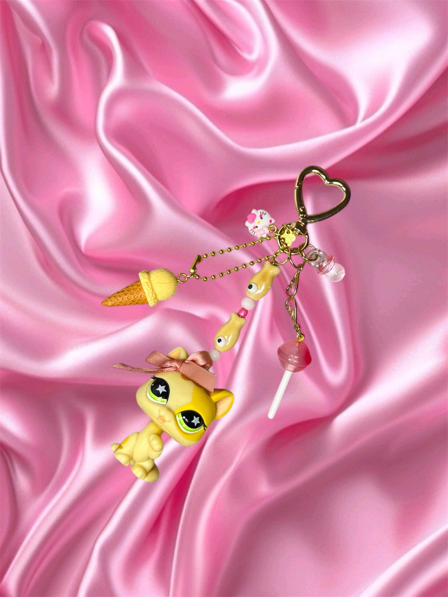 Matériaux : figurine d’occasion (plastique / PVC / résine selon pièce), anneau/maillon acier inoxydable, tige/rivets métalliques ou mousqueton selon modèle. Chaque création est complétée avec un ou plusieurs charms décoratifs et perles.