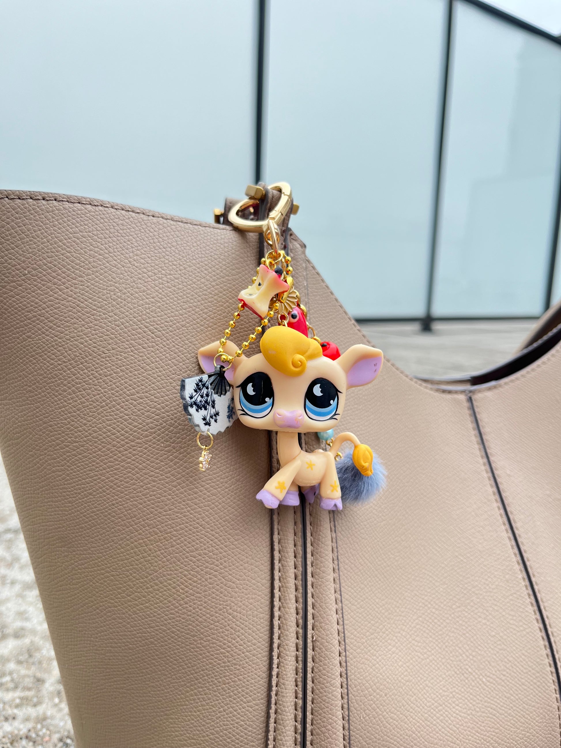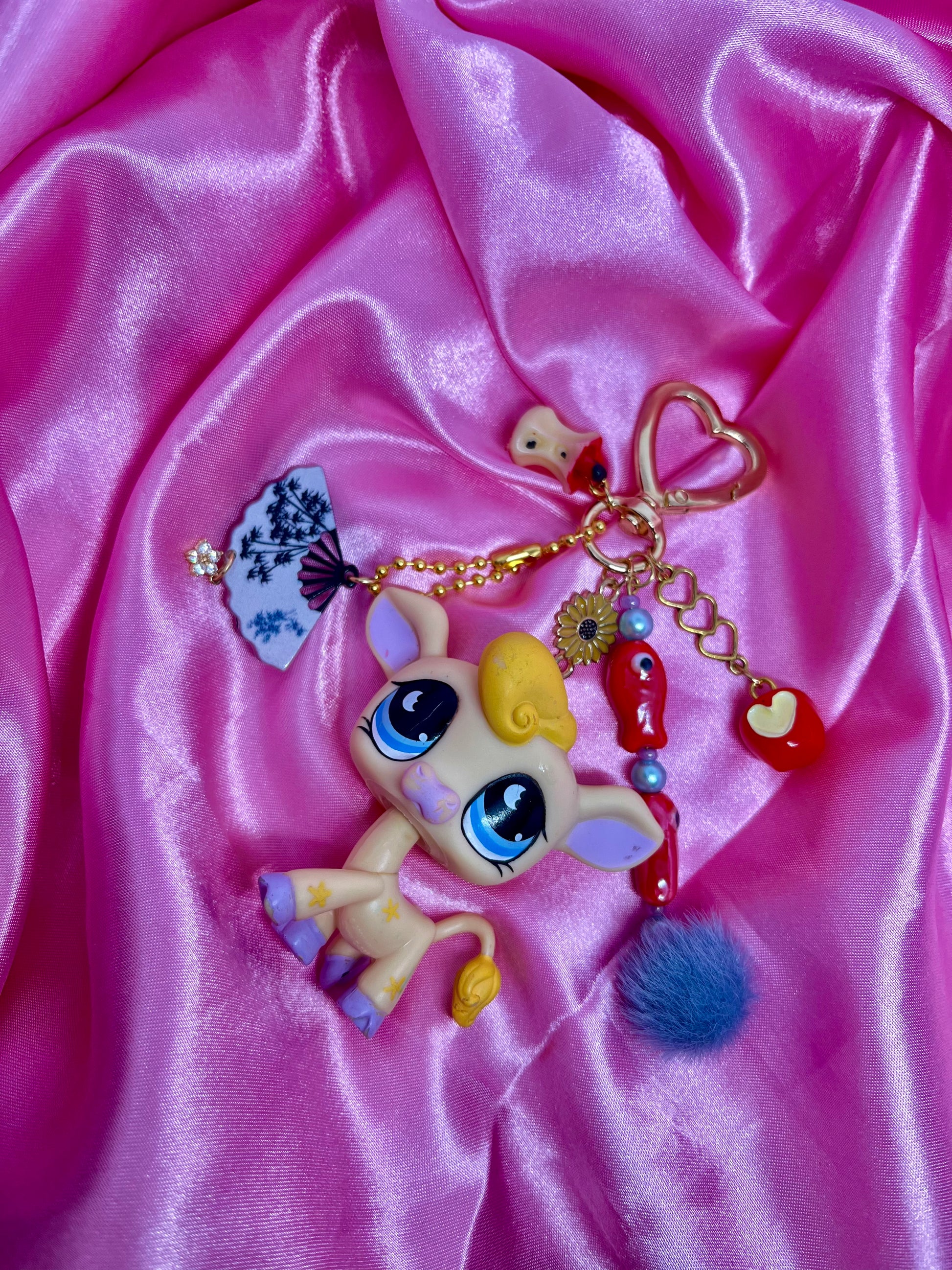 Matériaux : figurine d’occasion (plastique / PVC / résine selon pièce), anneau/maillon acier inoxydable, tige/rivets métalliques ou mousqueton selon modèle. Chaque création est complétée avec un ou plusieurs charms décoratifs et perles.