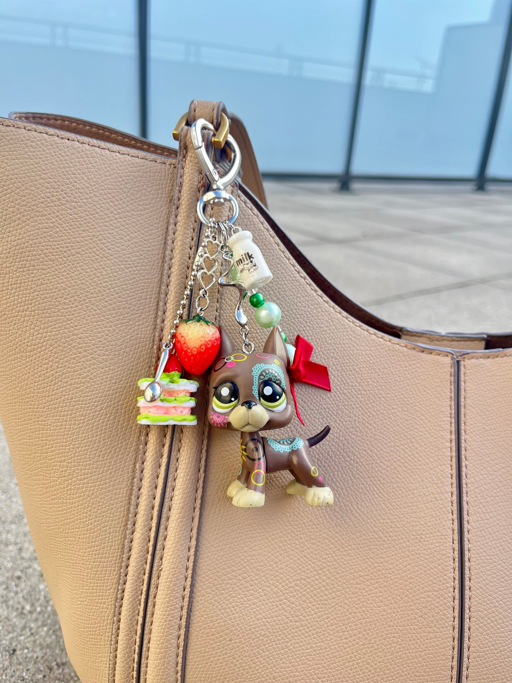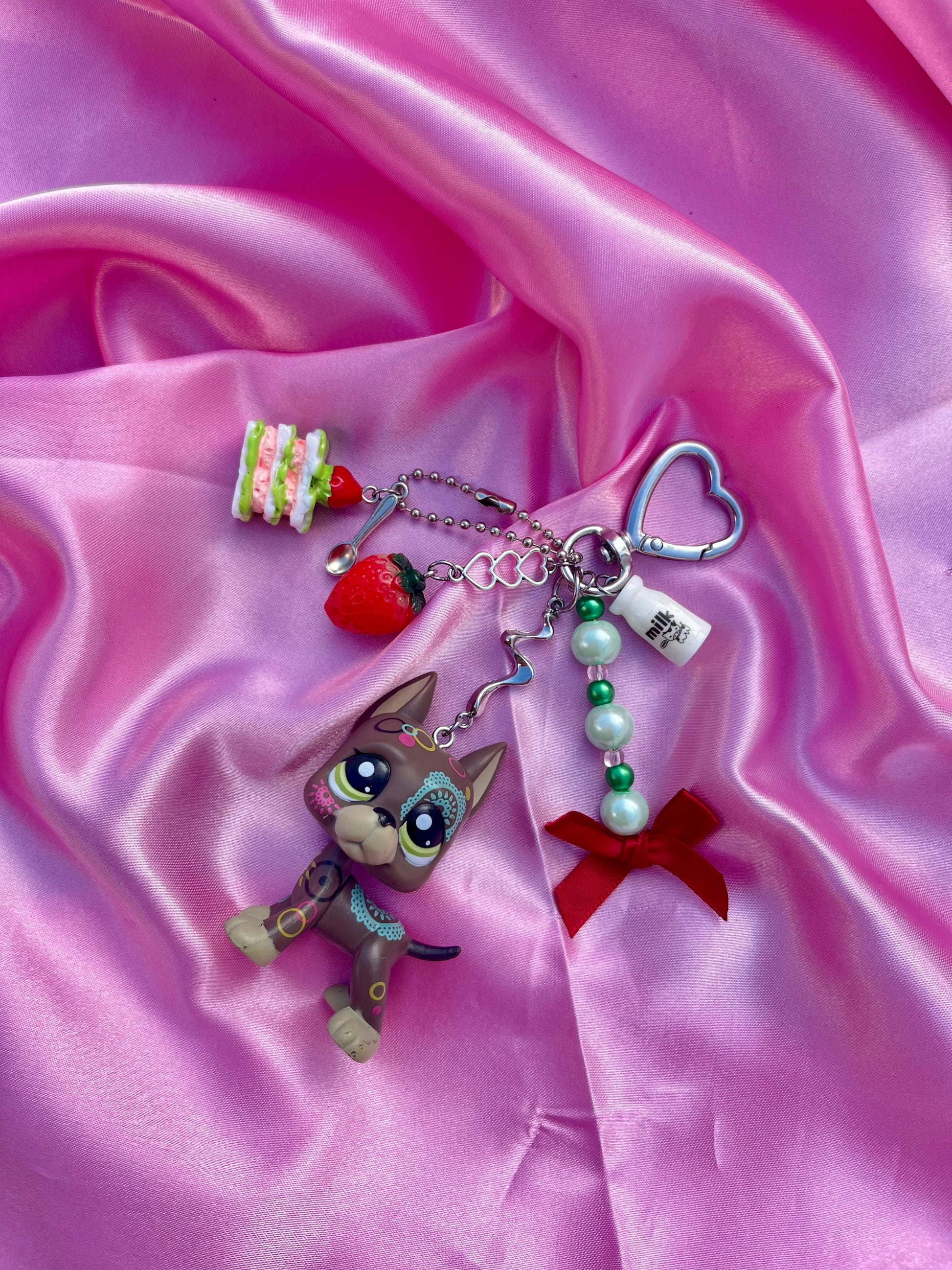 Matériaux : figurine d’occasion (plastique / PVC / résine selon pièce), anneau/maillon acier inoxydable, tige/rivets métalliques ou mousqueton selon modèle. Chaque création est complétée avec un ou plusieurs charms décoratifs et perles.