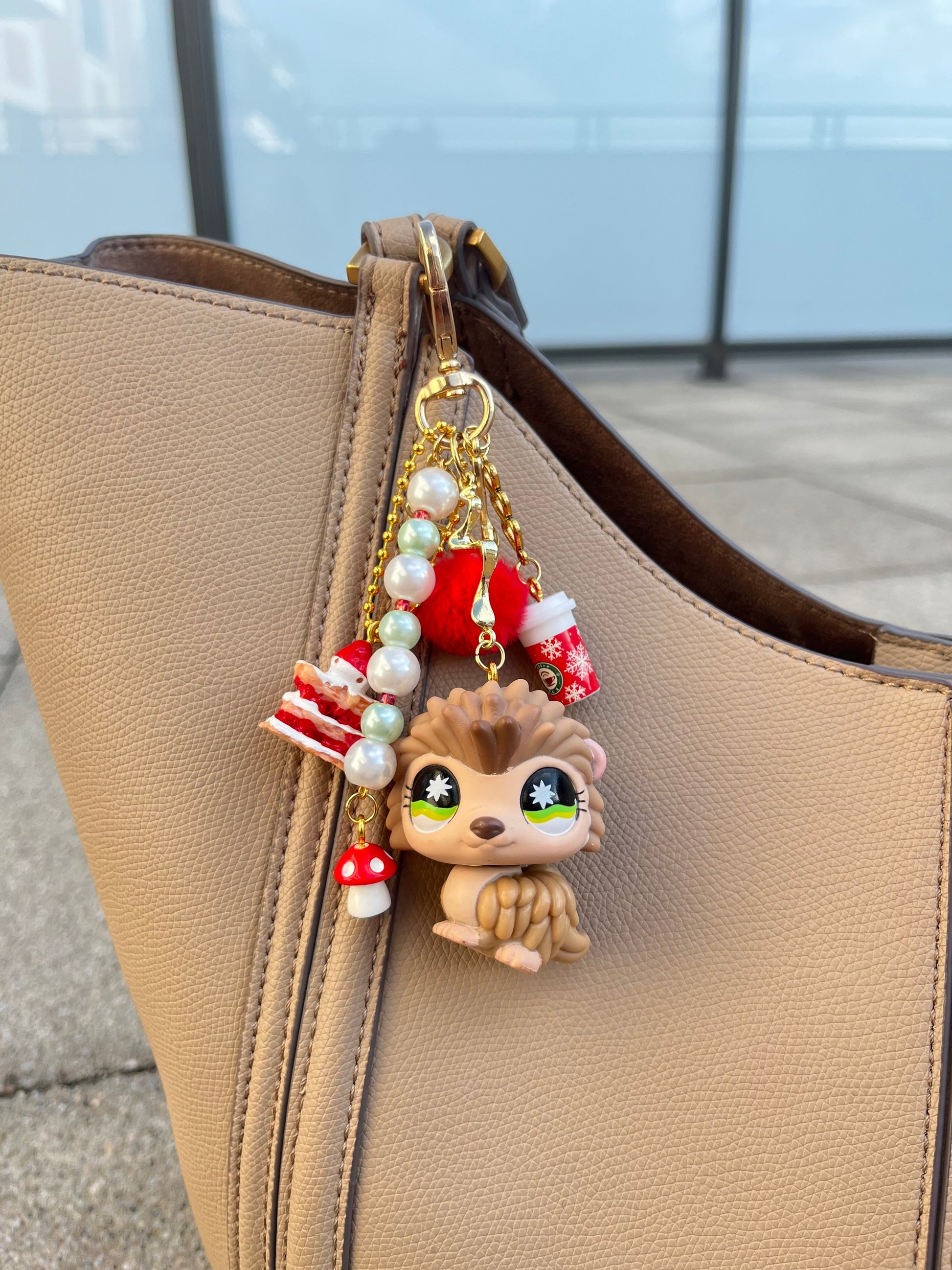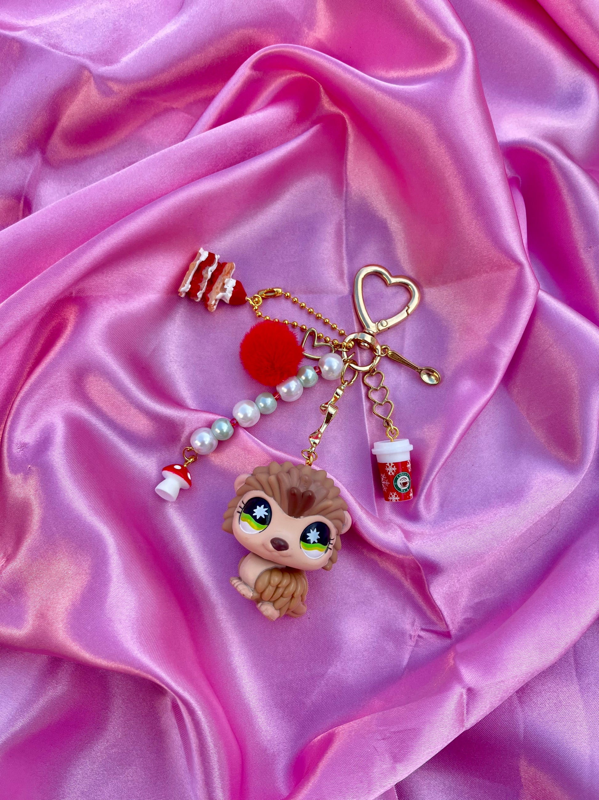 Matériaux : figurine d’occasion (plastique / PVC / résine selon pièce), anneau/maillon acier inoxydable, tige/rivets métalliques ou mousqueton selon modèle. Chaque création est complétée avec un ou plusieurs charms décoratifs et perles.