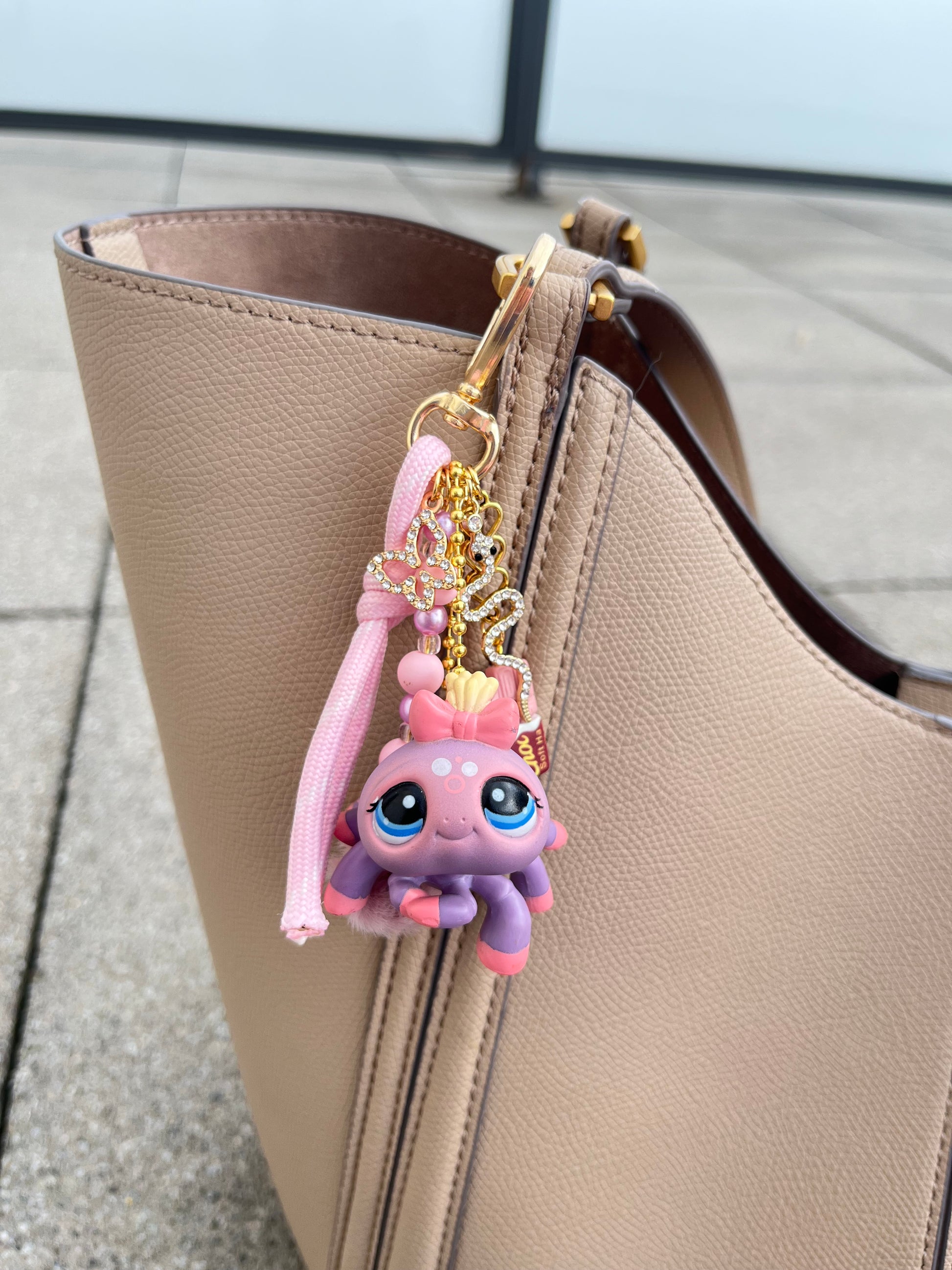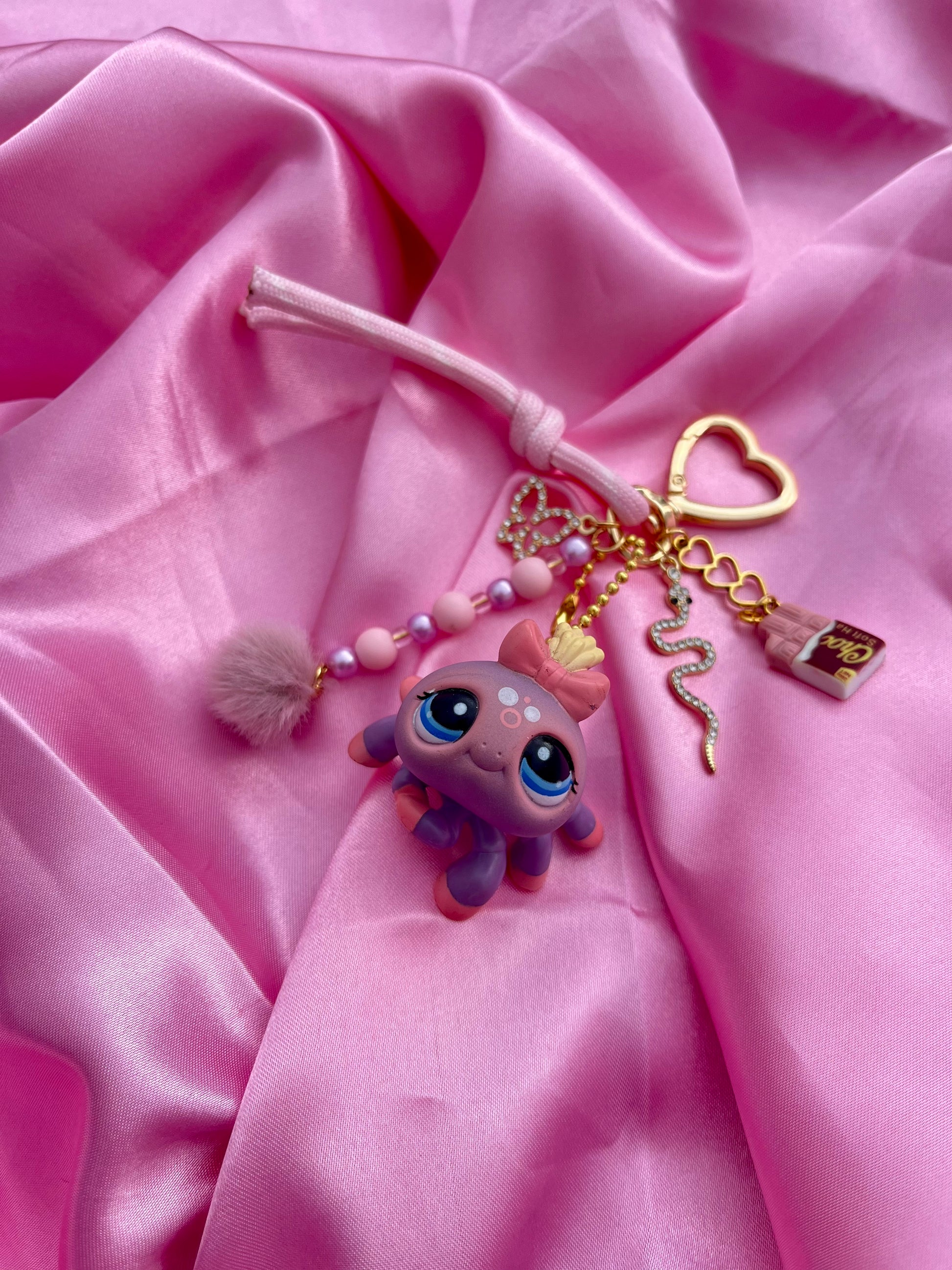Matériaux : figurine d’occasion (plastique / PVC / résine selon pièce), anneau/maillon acier inoxydable, tige/rivets métalliques ou mousqueton selon modèle. Chaque création est complétée avec un ou plusieurs charms décoratifs et perles.