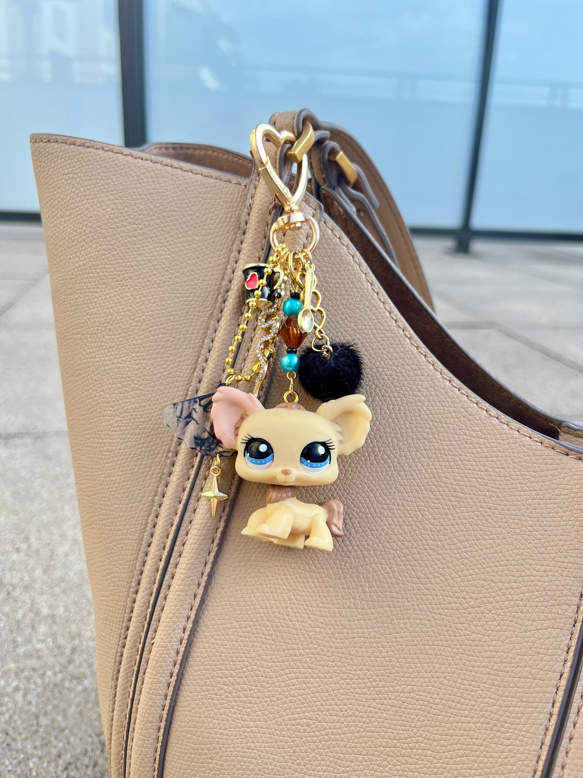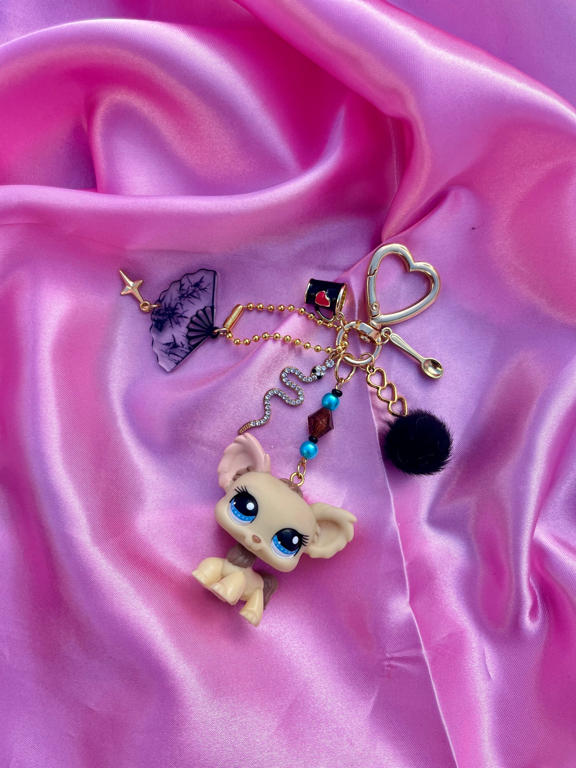 Matériaux : figurine d’occasion (plastique / PVC / résine selon pièce), anneau/maillon acier inoxydable, tige/rivets métalliques ou mousqueton selon modèle. Chaque création est complétée avec un ou plusieurs charms décoratifs et perles.