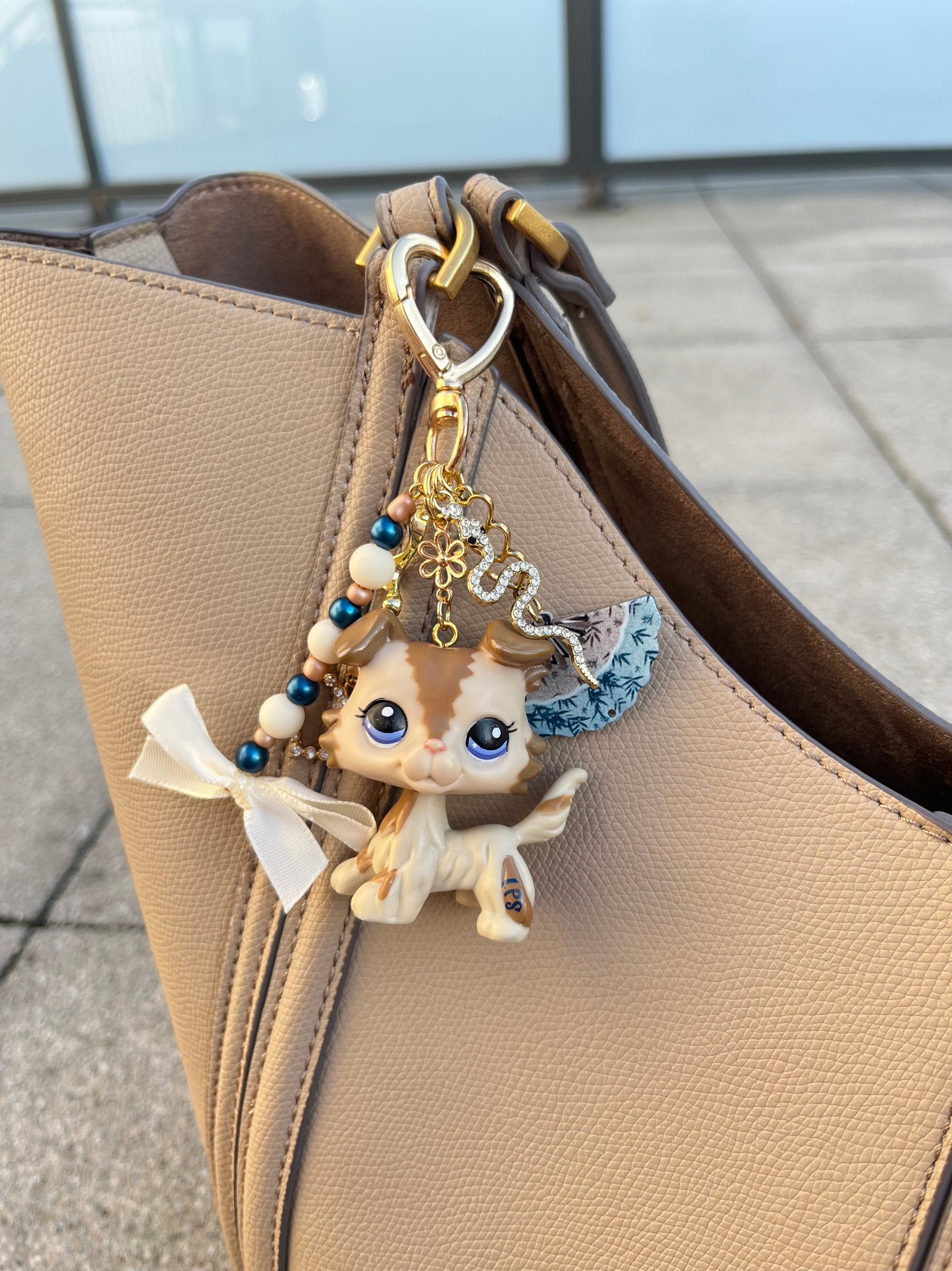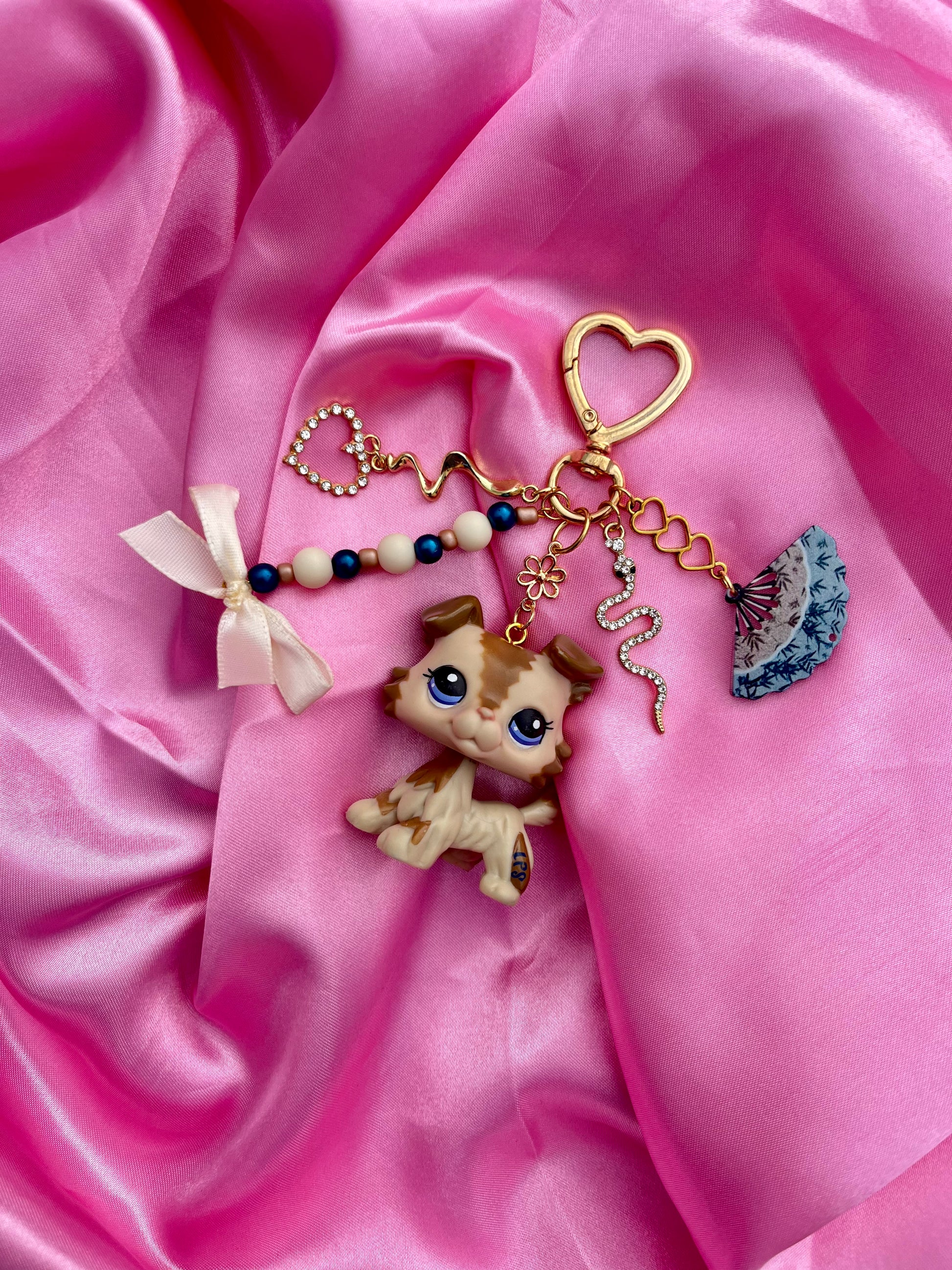 Matériaux : figurine d’occasion (plastique / PVC / résine selon pièce), anneau/maillon acier inoxydable, tige/rivets métalliques ou mousqueton selon modèle. Chaque création est complétée avec un ou plusieurs charms décoratifs et perles.
