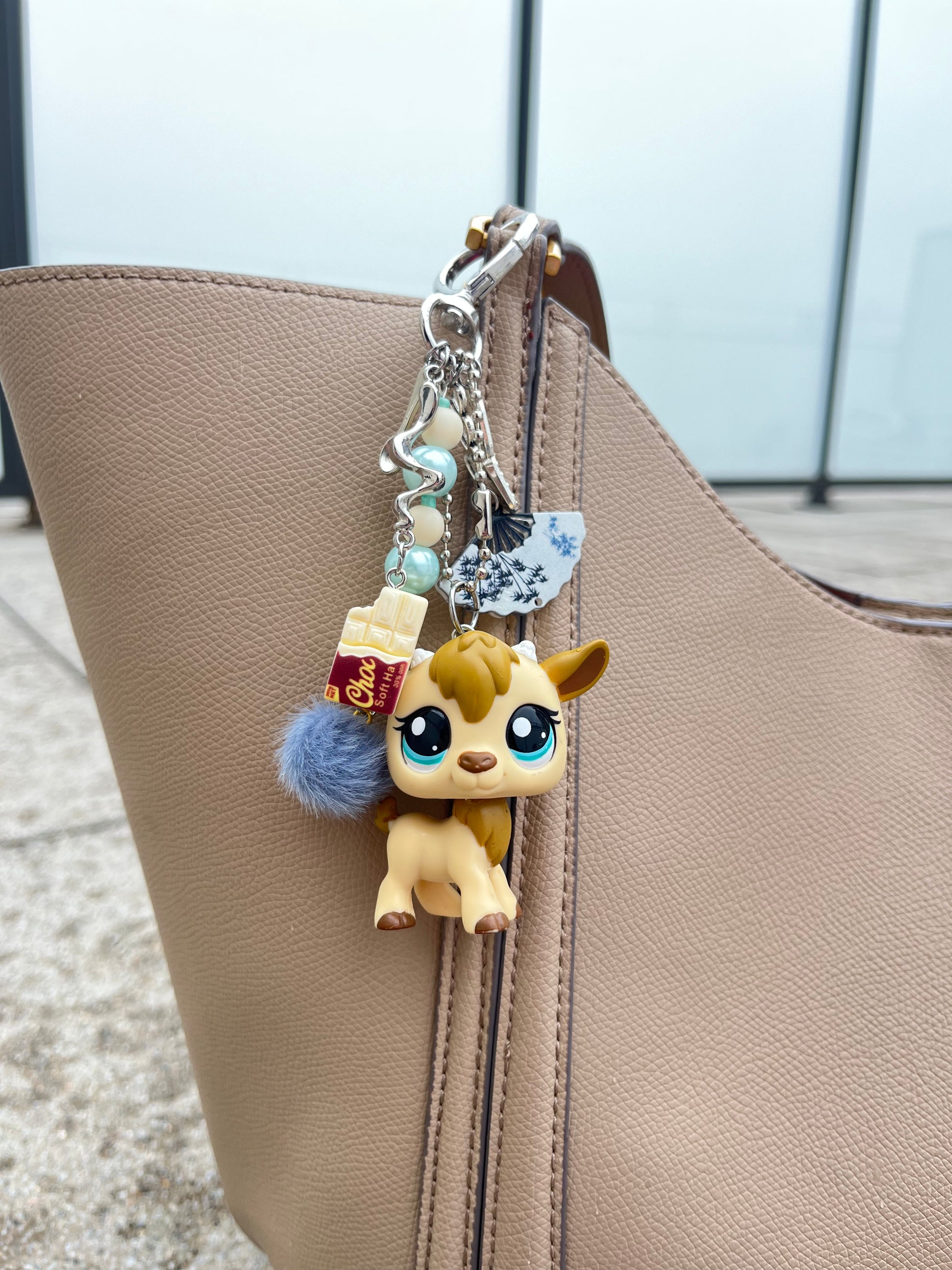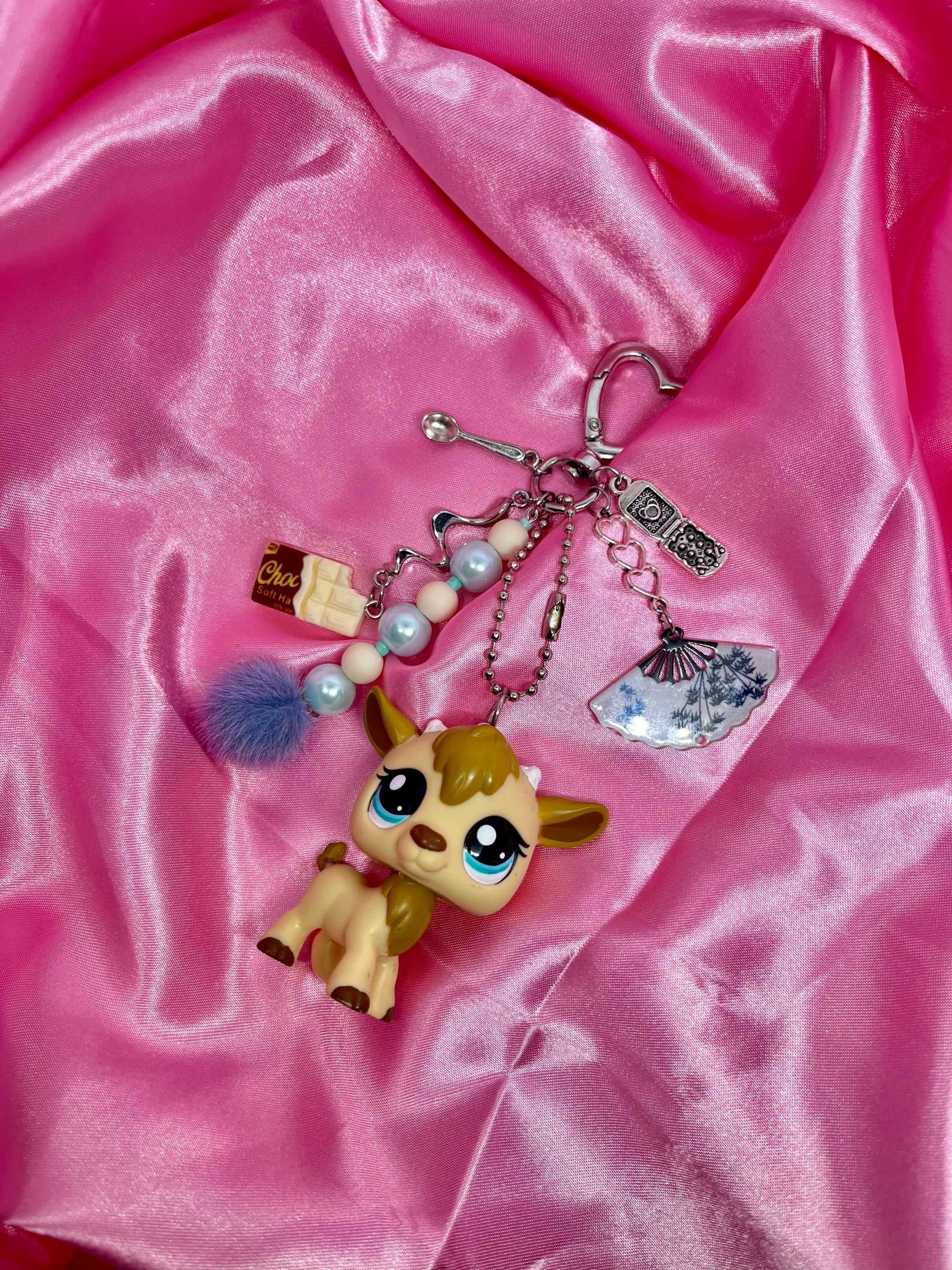 Matériaux : figurine d’occasion (plastique / PVC / résine selon pièce), anneau/maillon acier inoxydable, tige/rivets métalliques ou mousqueton selon modèle. Chaque création est complétée avec un ou plusieurs charms décoratifs et perles.
