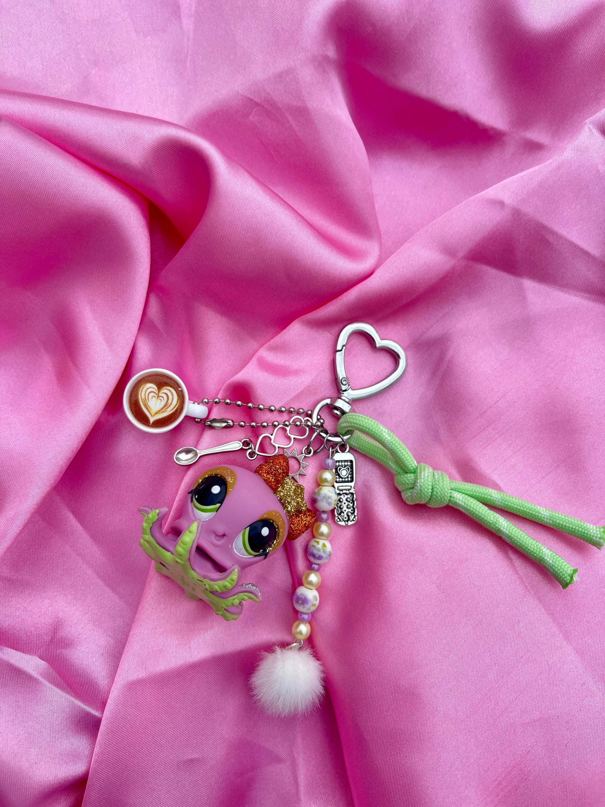 Matériaux : figurine d’occasion (plastique / PVC / résine selon pièce), anneau/maillon acier inoxydable, tige/rivets métalliques ou mousqueton selon modèle. Chaque création est complétée avec un ou plusieurs charms décoratifs et perles.