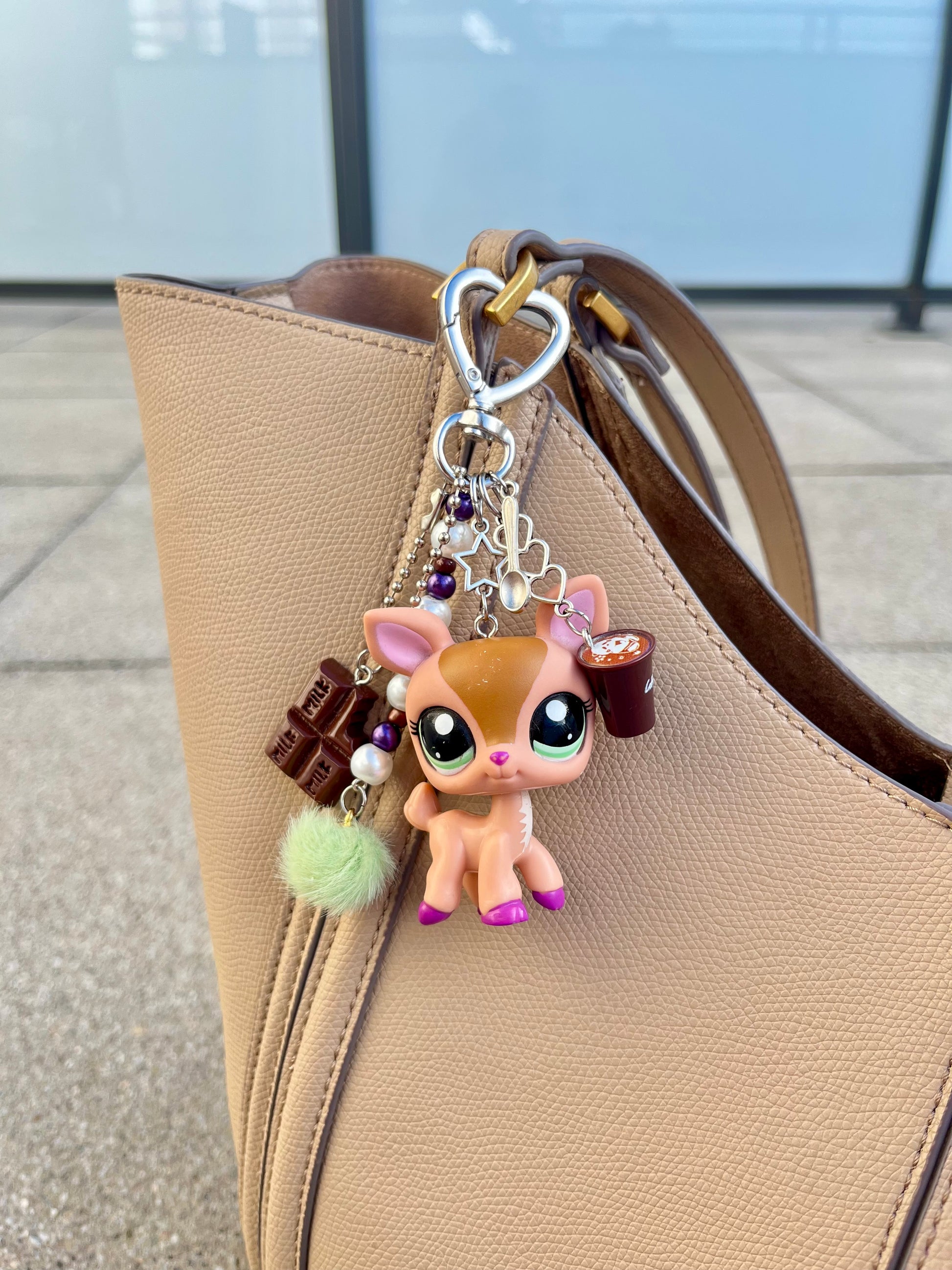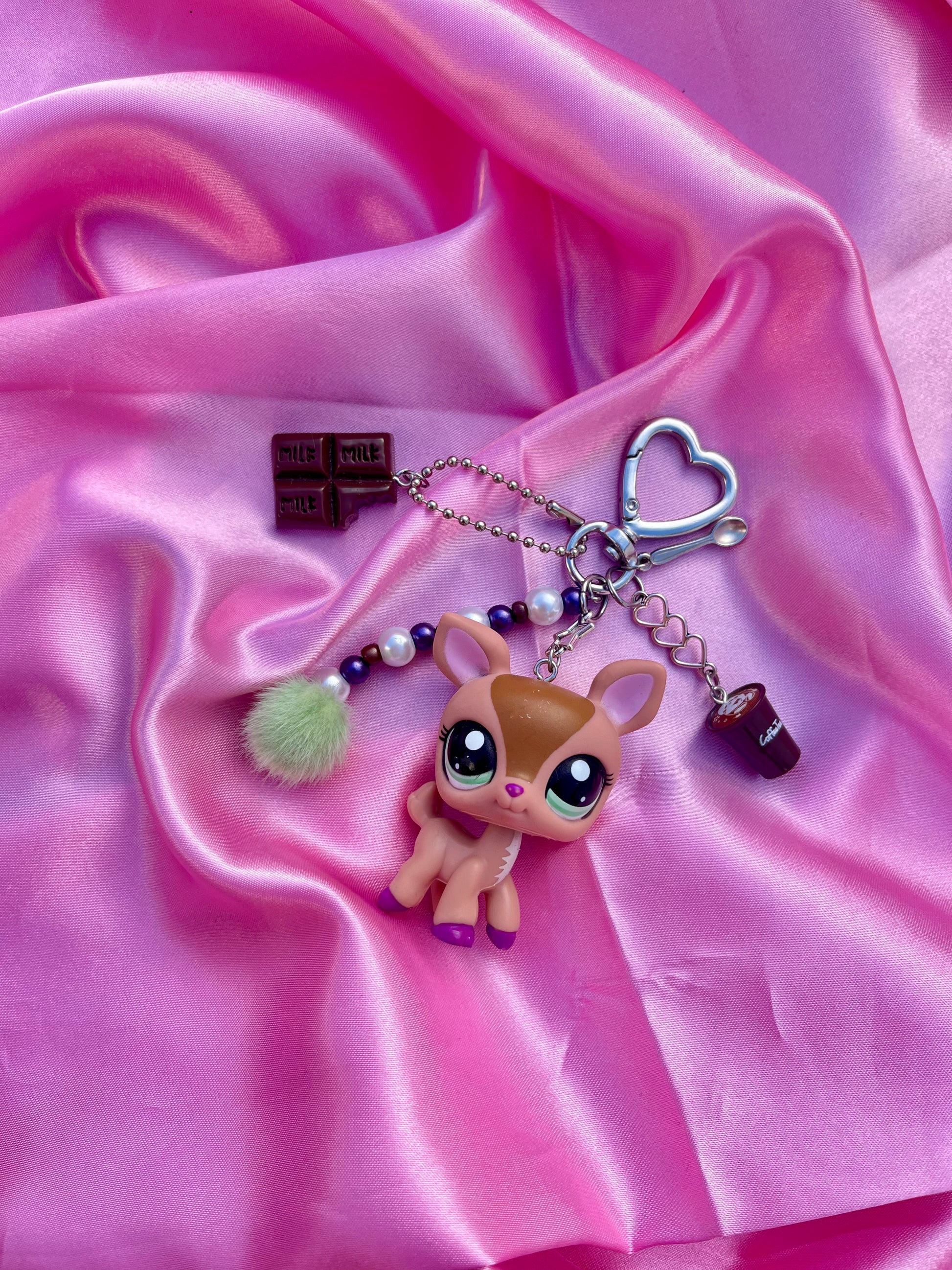 Matériaux : figurine d’occasion (plastique / PVC / résine selon pièce), anneau/maillon acier inoxydable, tige/rivets métalliques ou mousqueton selon modèle. Chaque création est complétée avec un ou plusieurs charms décoratifs et perles.