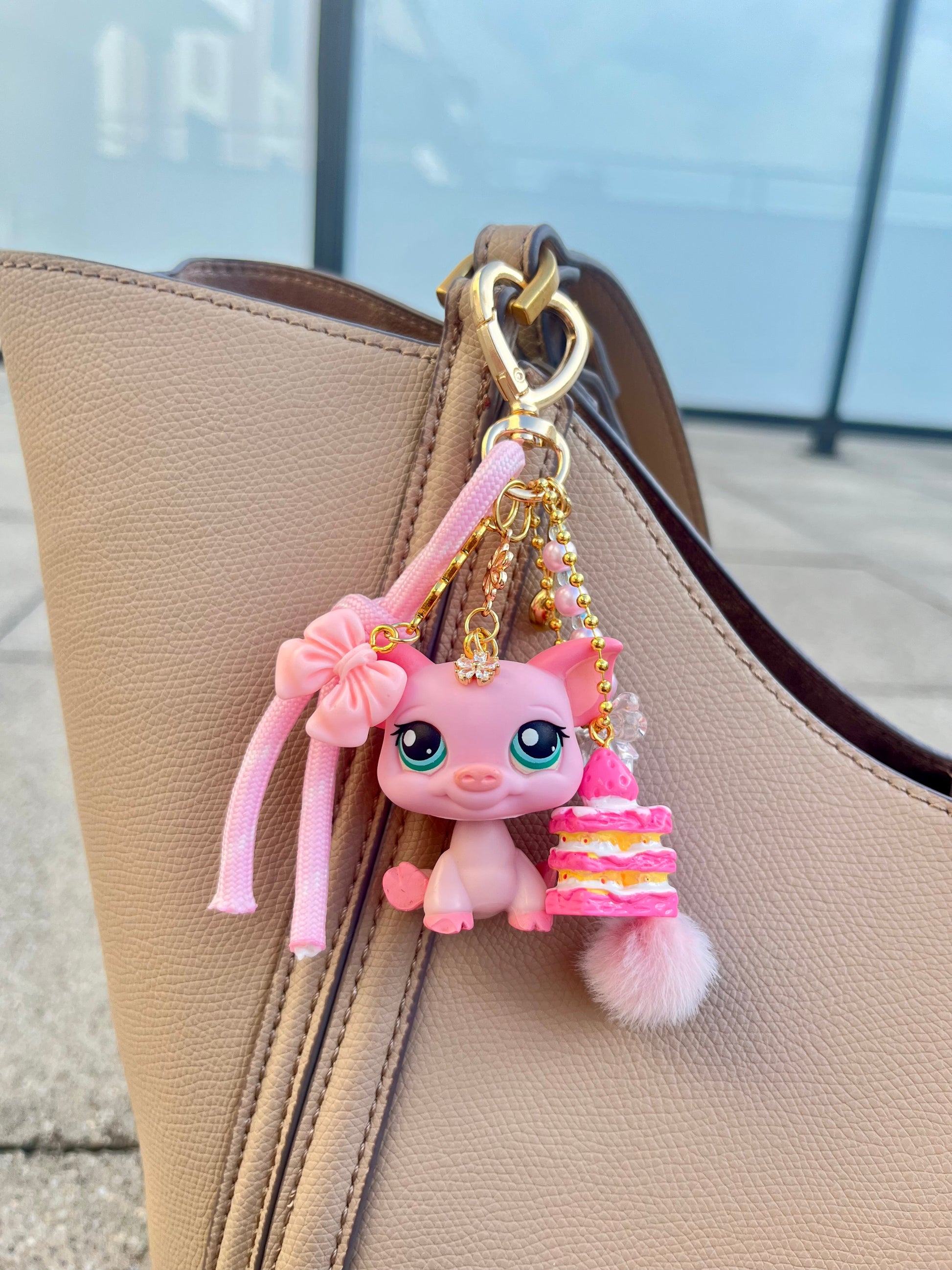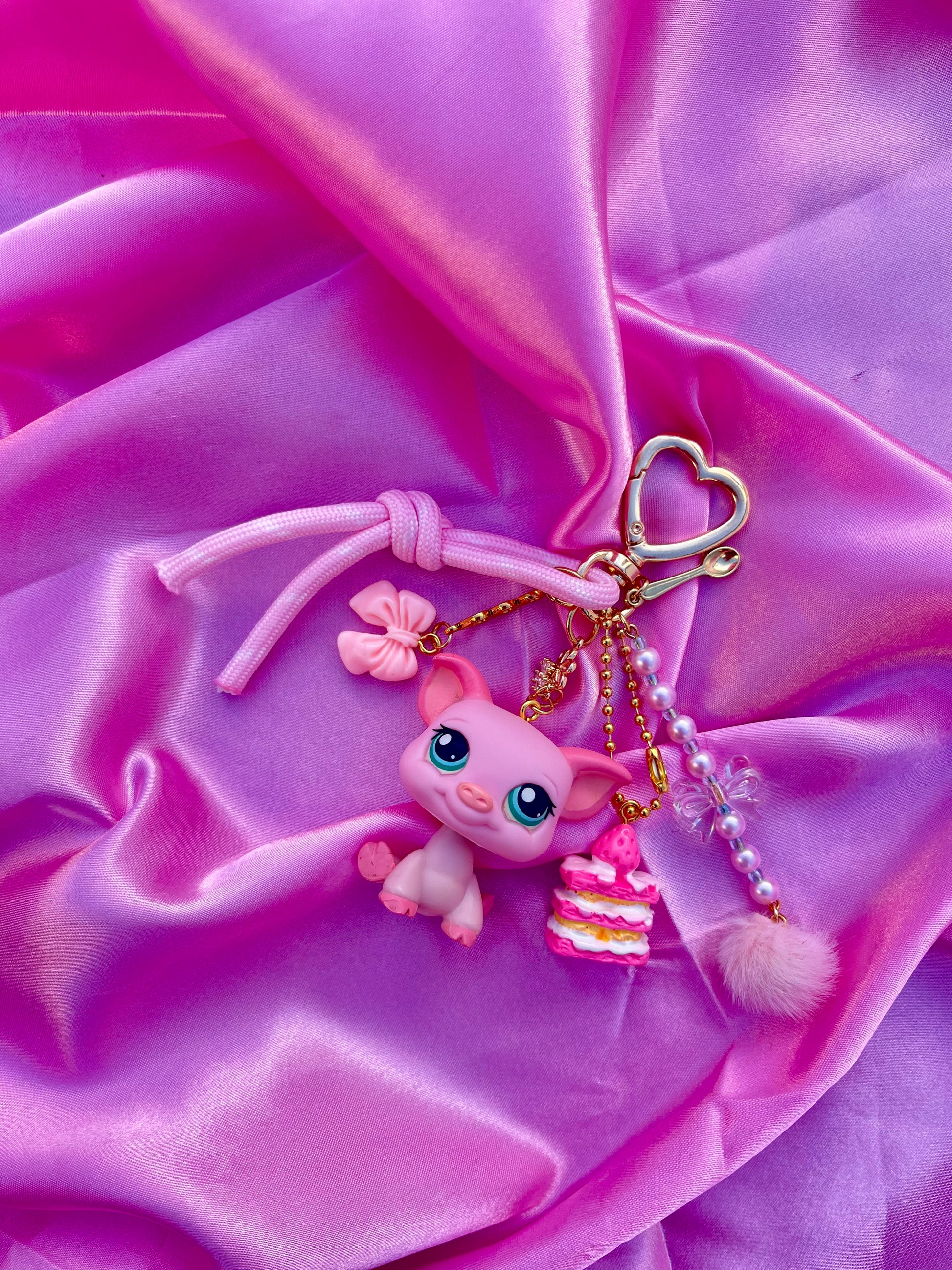 Matériaux : figurine d’occasion (plastique / PVC / résine selon pièce), anneau/maillon acier inoxydable, tige/rivets métalliques ou mousqueton selon modèle. Chaque création est complétée avec un ou plusieurs charms décoratifs et perles.