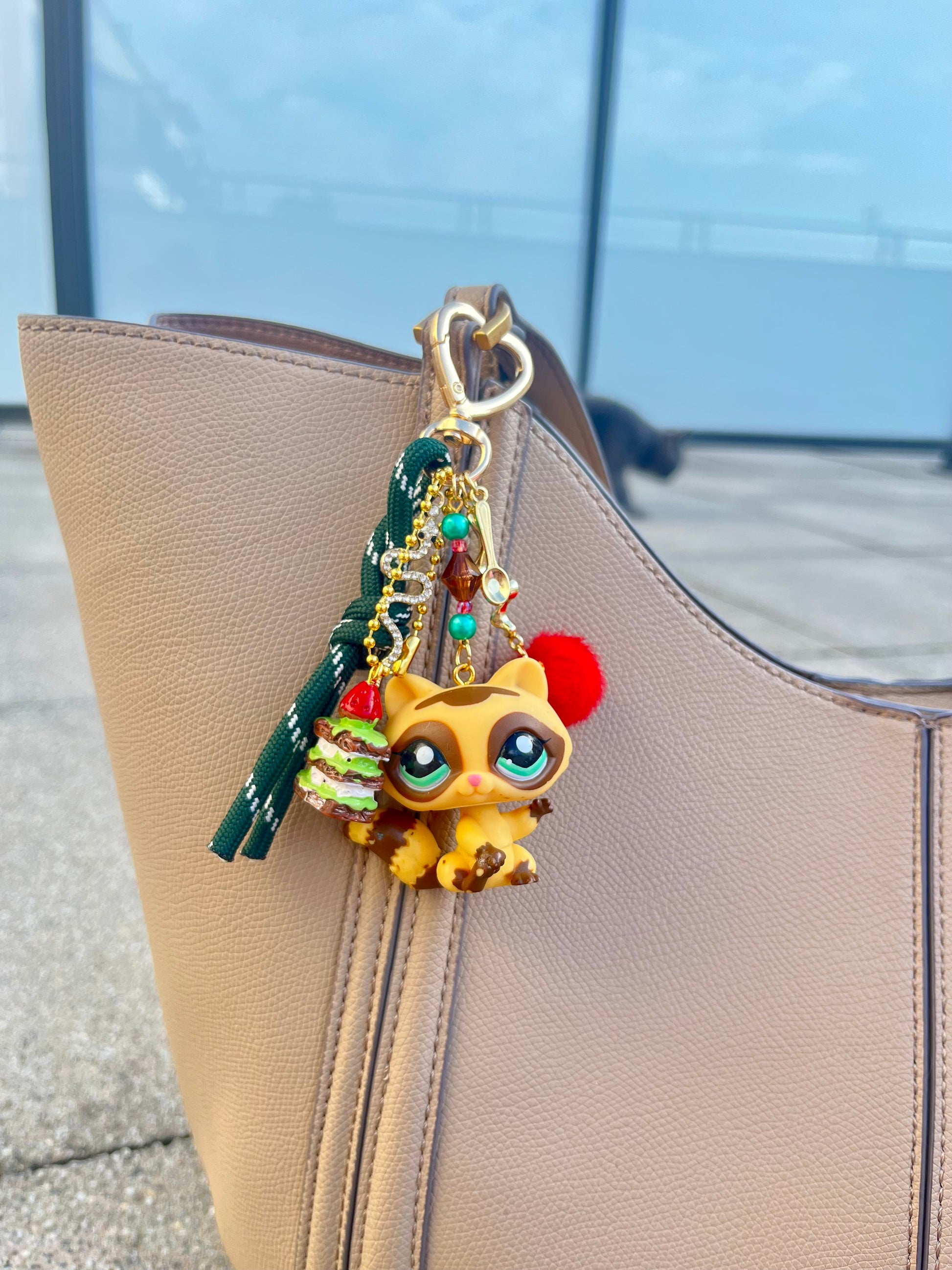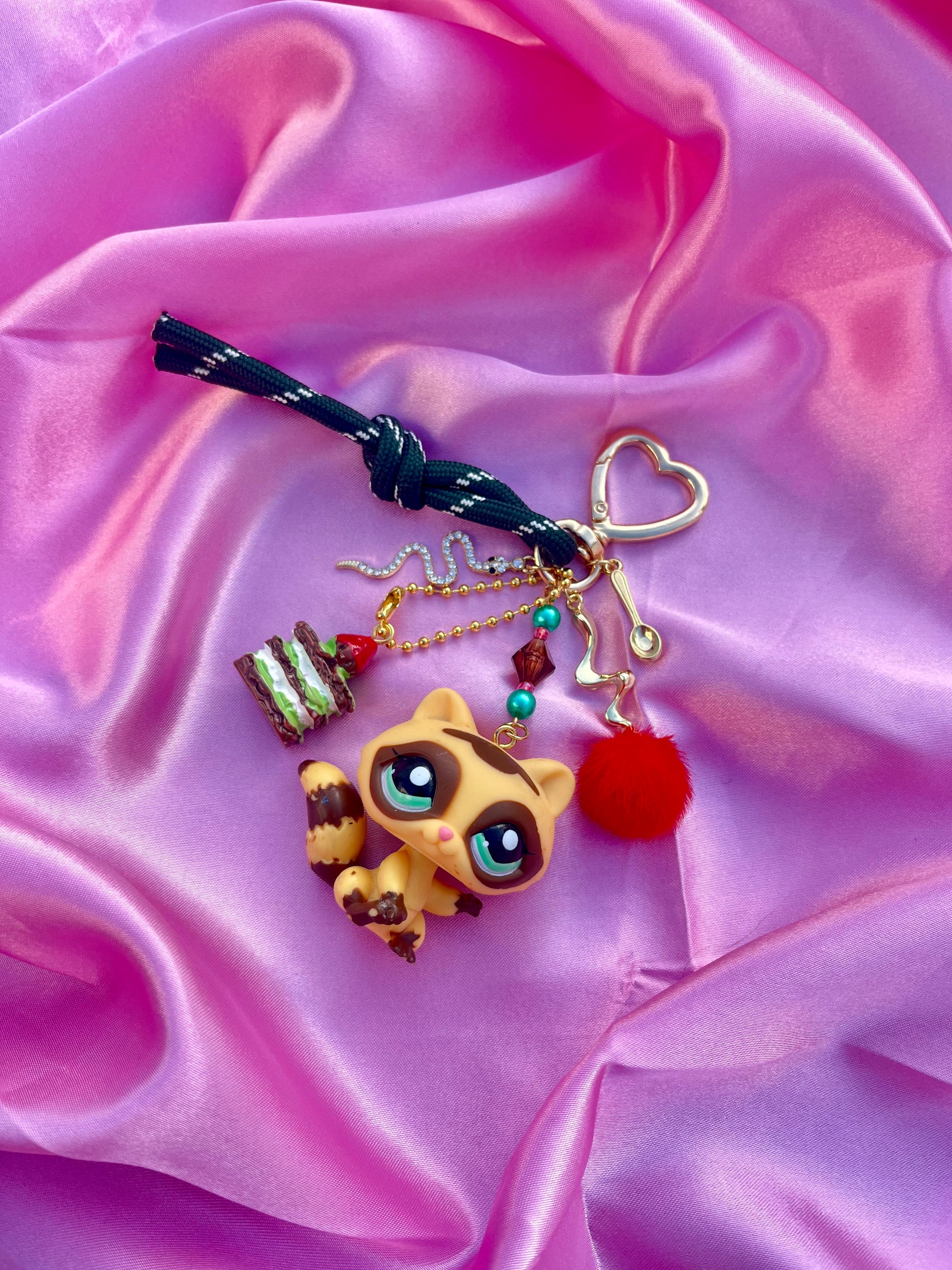 Matériaux : figurine d’occasion (plastique / PVC / résine selon pièce), anneau/maillon acier inoxydable, tige/rivets métalliques ou mousqueton selon modèle. Chaque création est complétée avec un ou plusieurs charms décoratifs et perles.