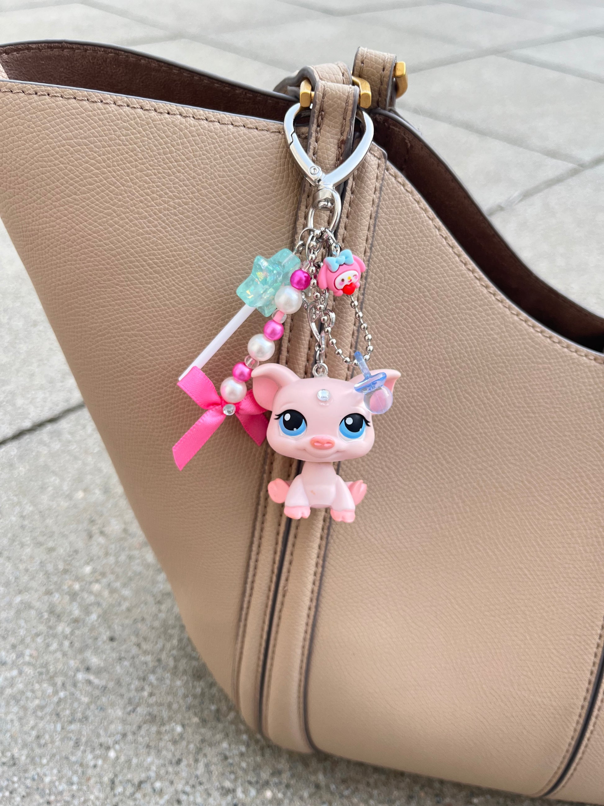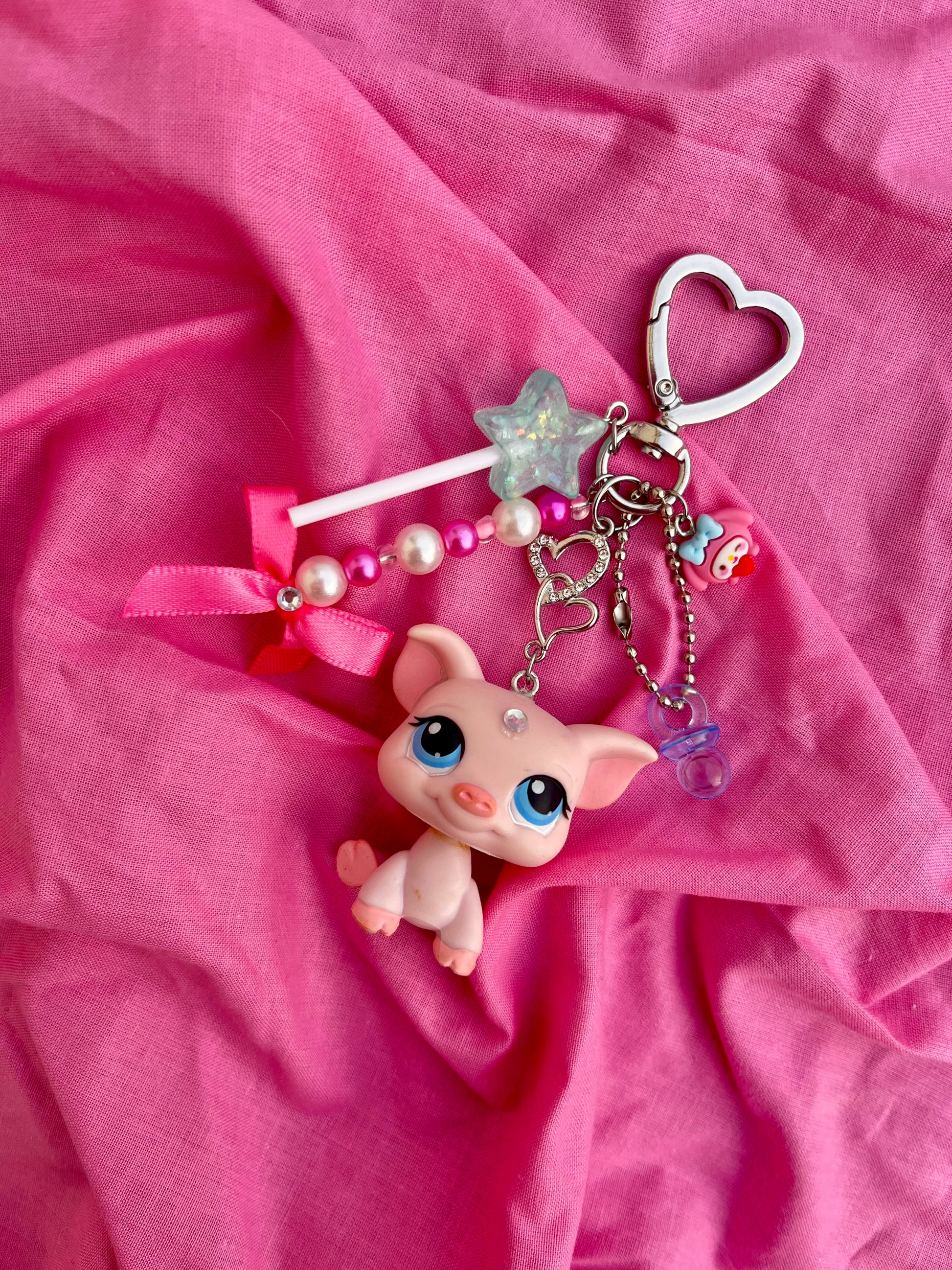 Matériaux : figurine d’occasion (plastique / PVC / résine selon pièce), anneau/maillon acier inoxydable, tige/rivets métalliques ou mousqueton selon modèle. Chaque création est complétée avec un ou plusieurs charms décoratifs et perles.