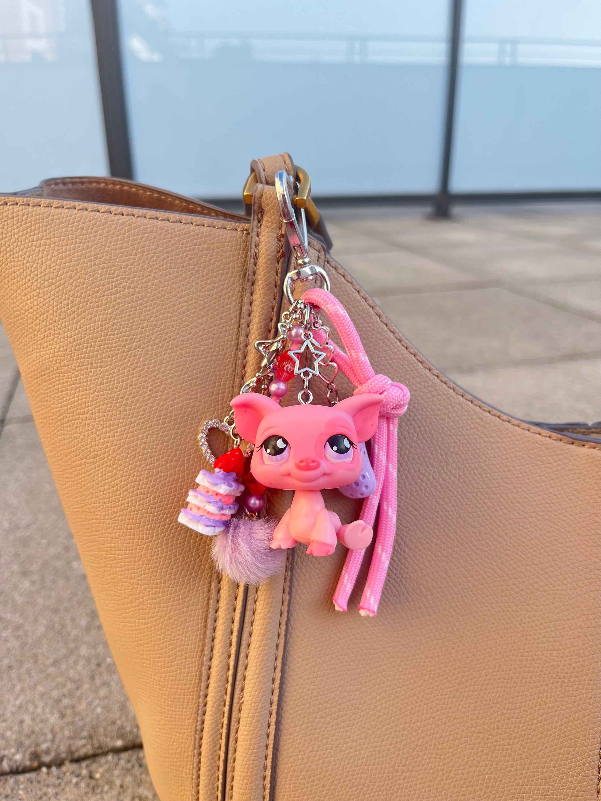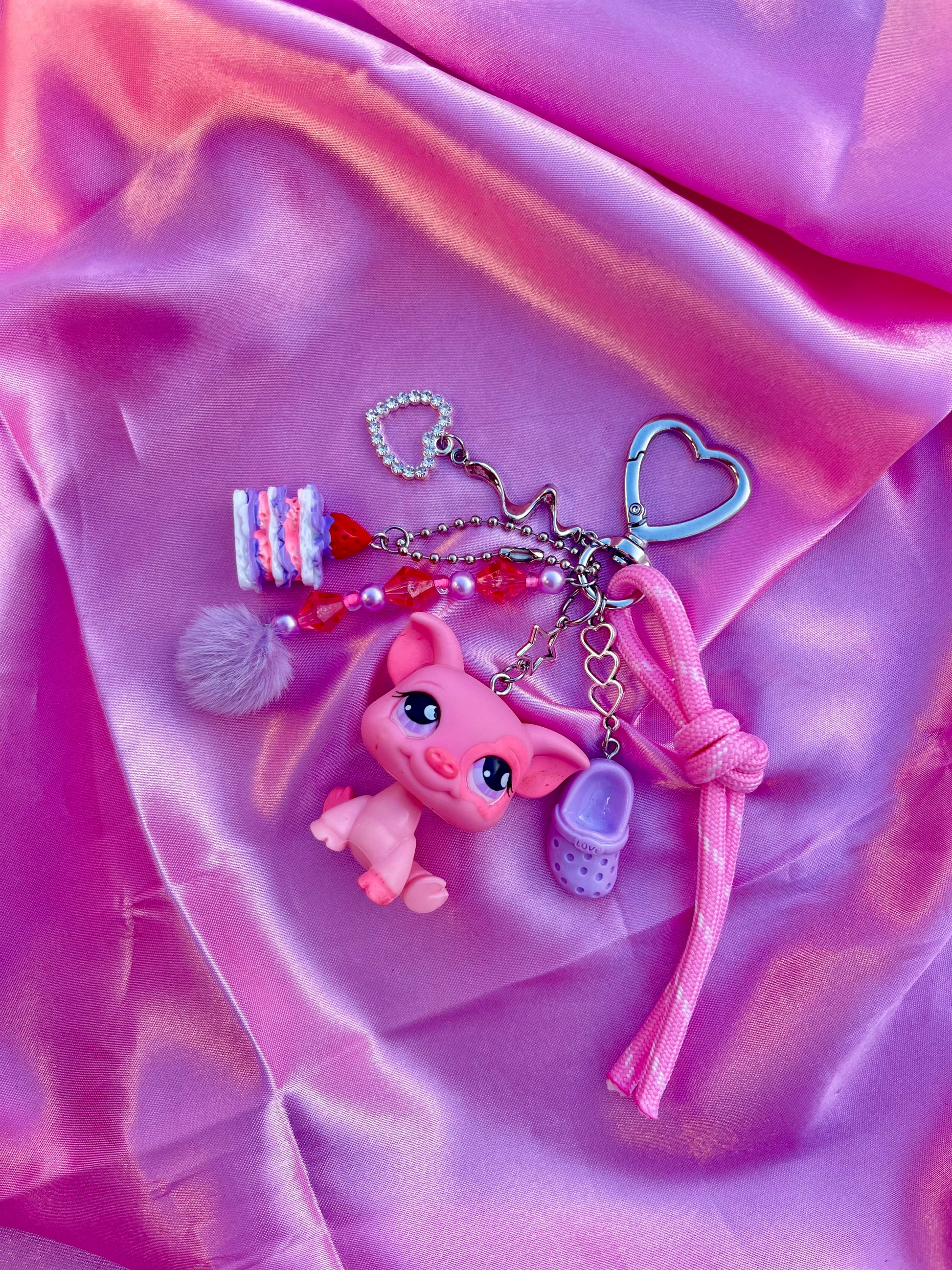 Matériaux : figurine d’occasion (plastique / PVC / résine selon pièce), anneau/maillon acier inoxydable, tige/rivets métalliques ou mousqueton selon modèle. Chaque création est complétée avec un ou plusieurs charms décoratifs et perles.