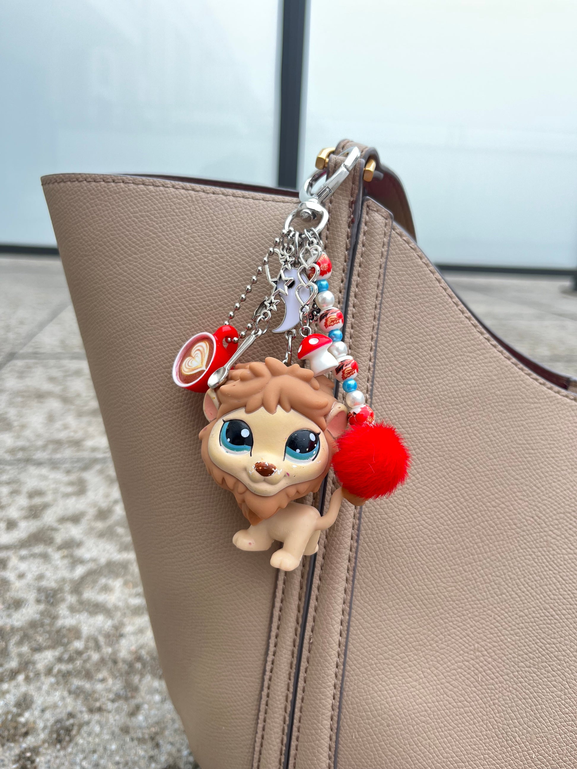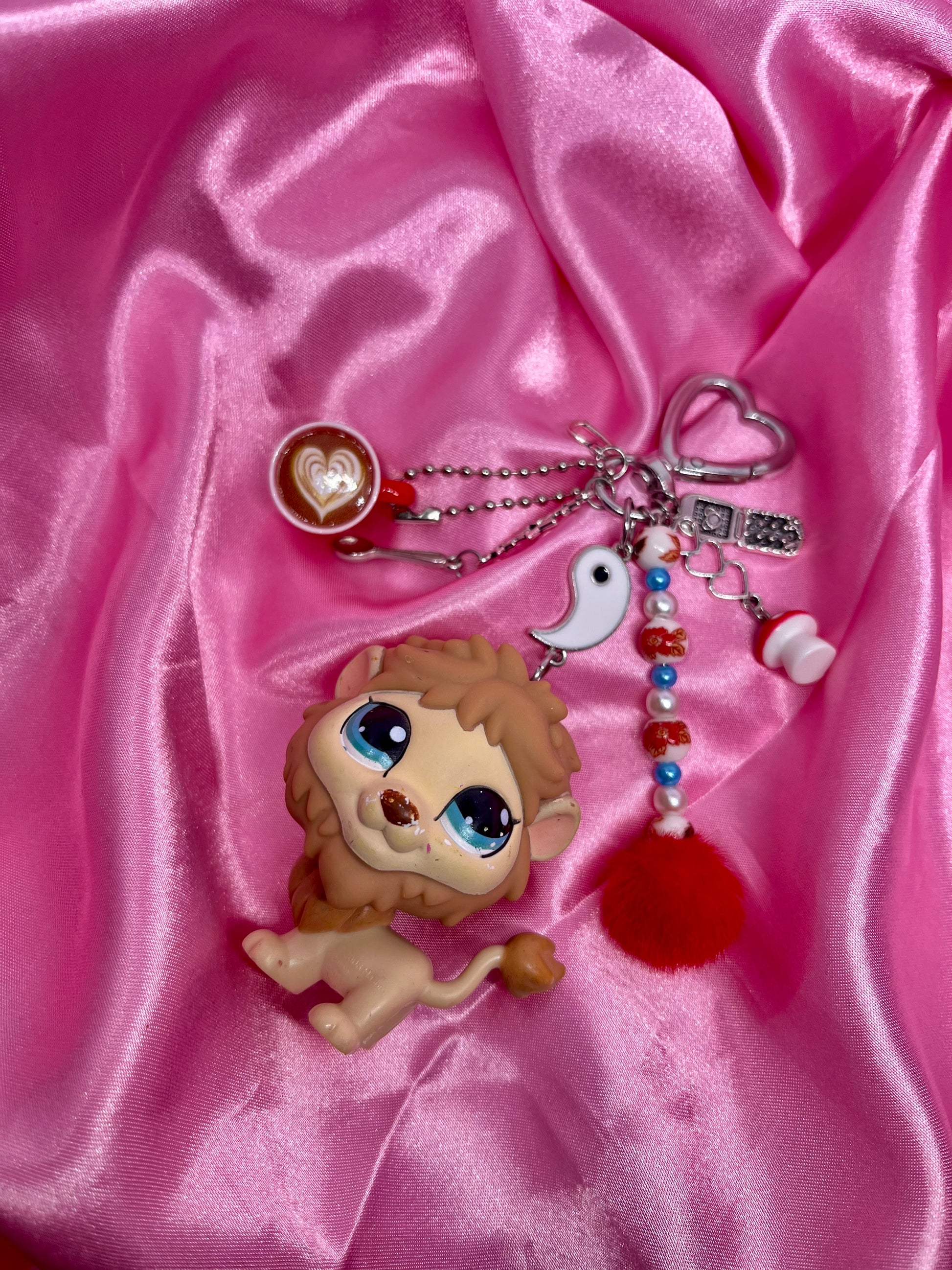 Matériaux : figurine d’occasion (plastique / PVC / résine selon pièce), anneau/maillon acier inoxydable, tige/rivets métalliques ou mousqueton selon modèle. Chaque création est complétée avec un ou plusieurs charms décoratifs et perles.